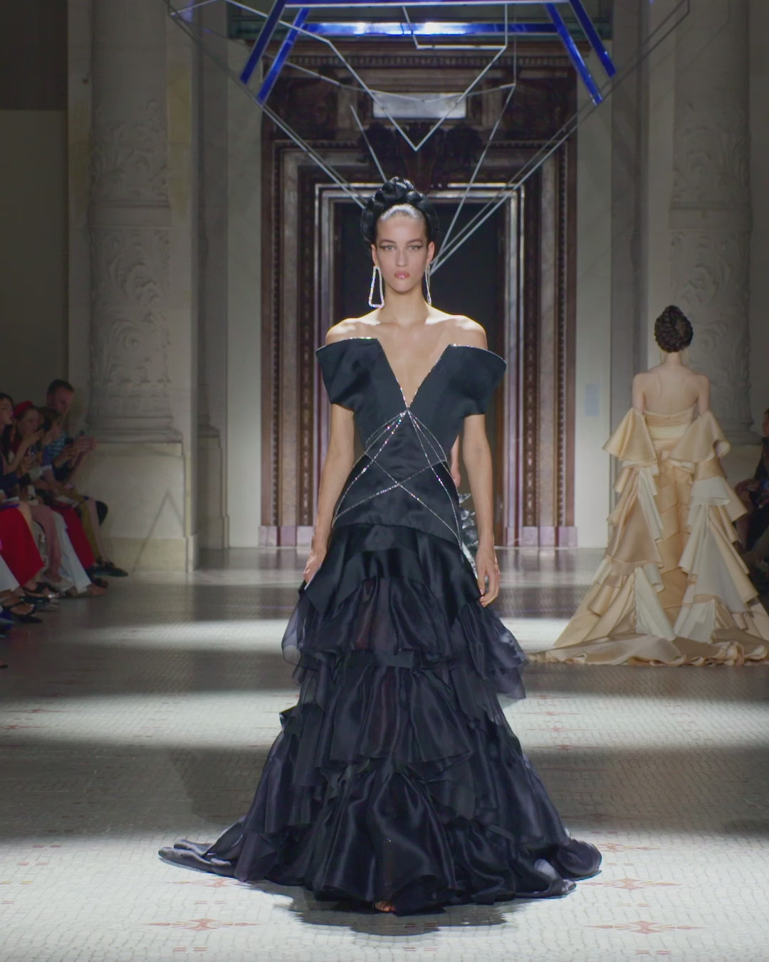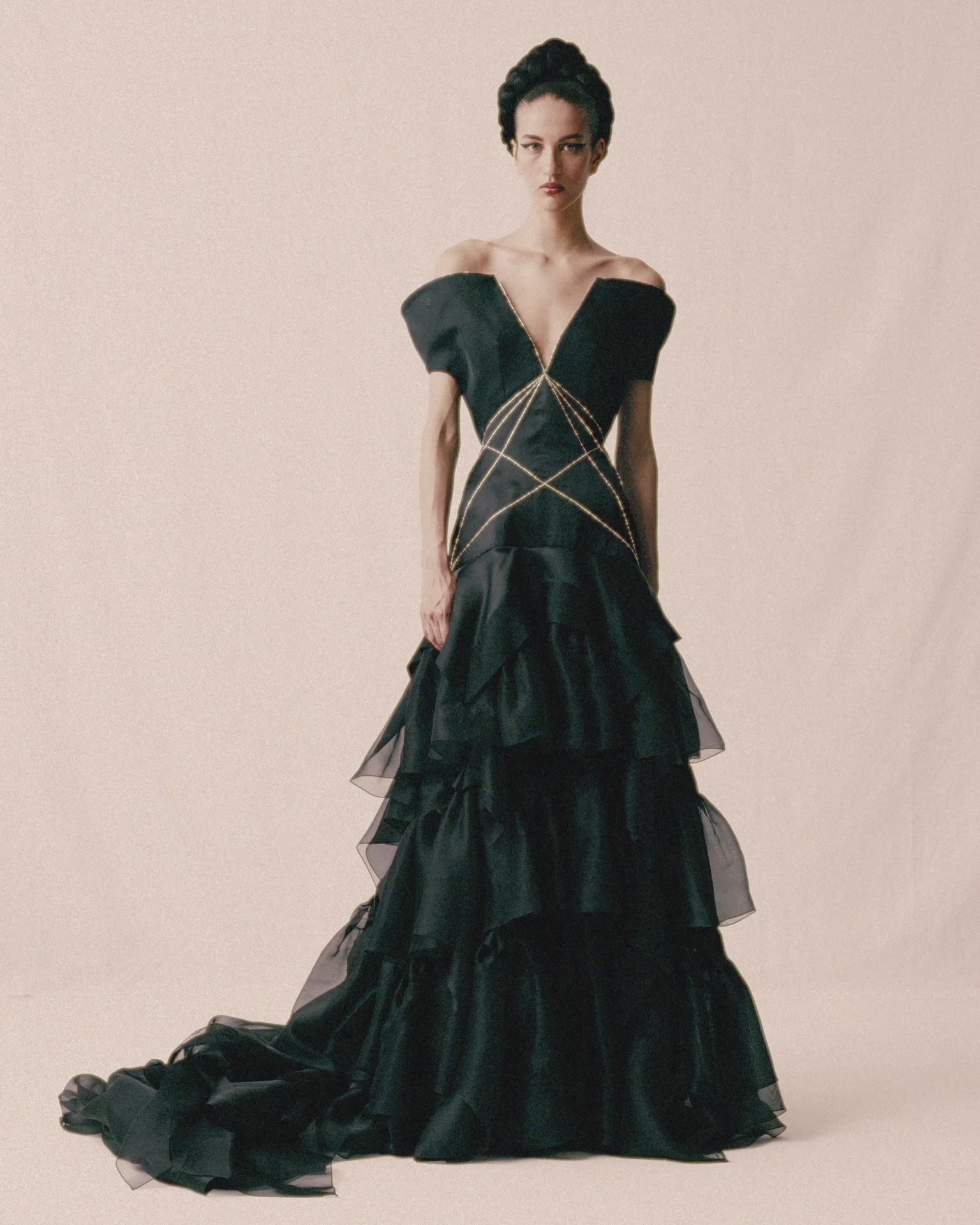 Geometric maxi dress featuring a bold V-shaped top in triple silk organza, lines of hand-embroidered glass beads creating rays of light around the hips, and a logo cut-out at the waist. Made of organic silk organza, the skirt is embellished with silk satin ribbons.