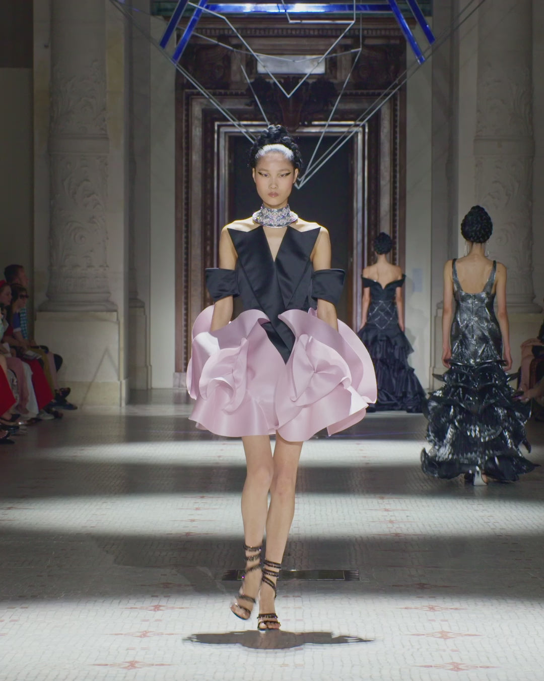 Tailored deconstructed cocktail dress with off-the-shoulder sleeves, wide lapels, and an exaggerated silhouette. Layered organza shapes envelop the skirt in mathematical movement inspired by the multiple dimensions of Calabi–Yau manifolds. The double-breasted dress is made in heavy organic silk satin with a high collar hand-embroidered by Maison Lesage with a three-dimensional interpretation of the ArdAzAei emblem in sequins, glass beads and crystal.