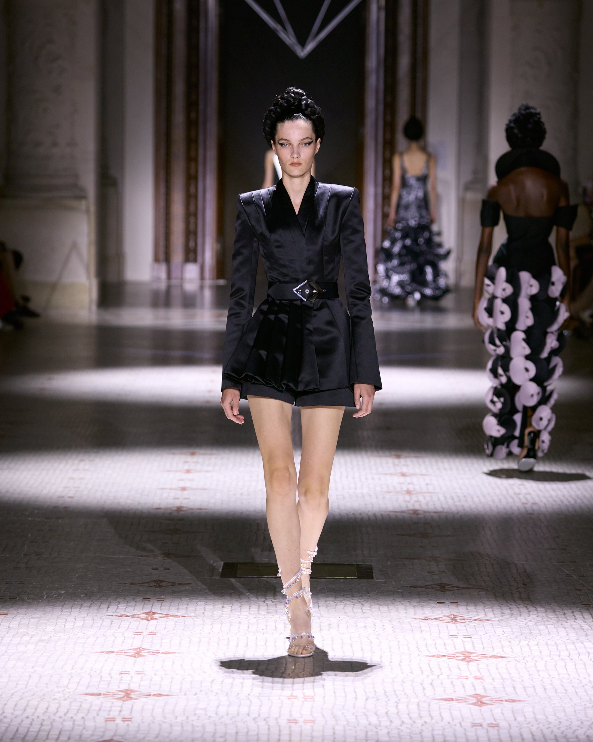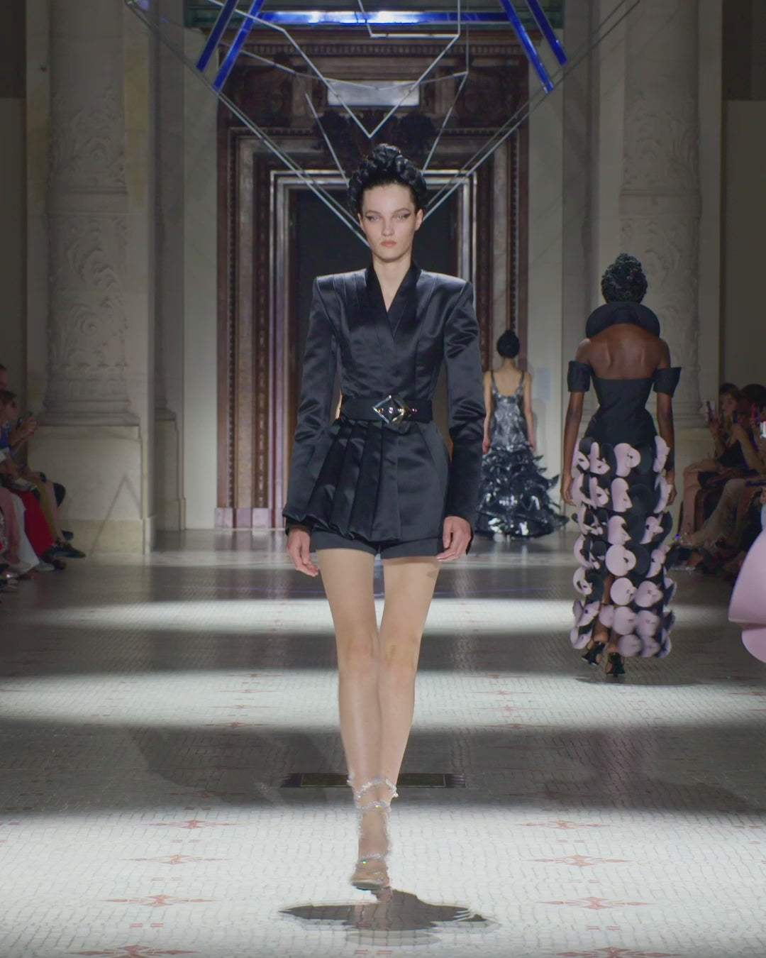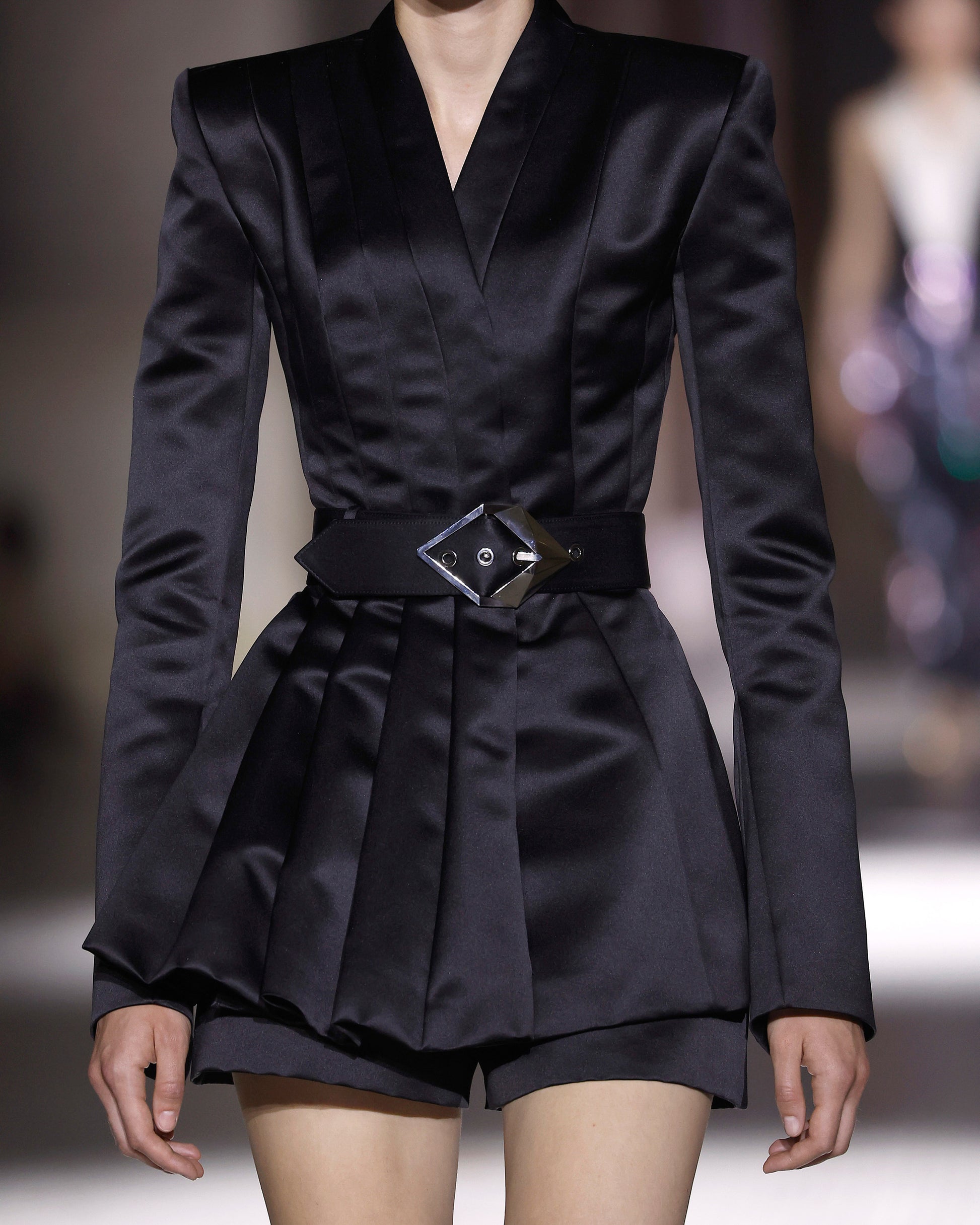 ArdAzAei signature jacket in heavy organic silk satin with asymmetric architectural pleats in the front and strong shoulders. The suit is paired with flared shorts in an A-shaped silhouette, with pleats in the front and back. Both pieces are GOTS-certified (Organic, certified by Ecocert Greenlife 257263).