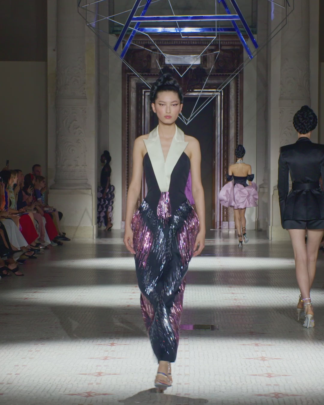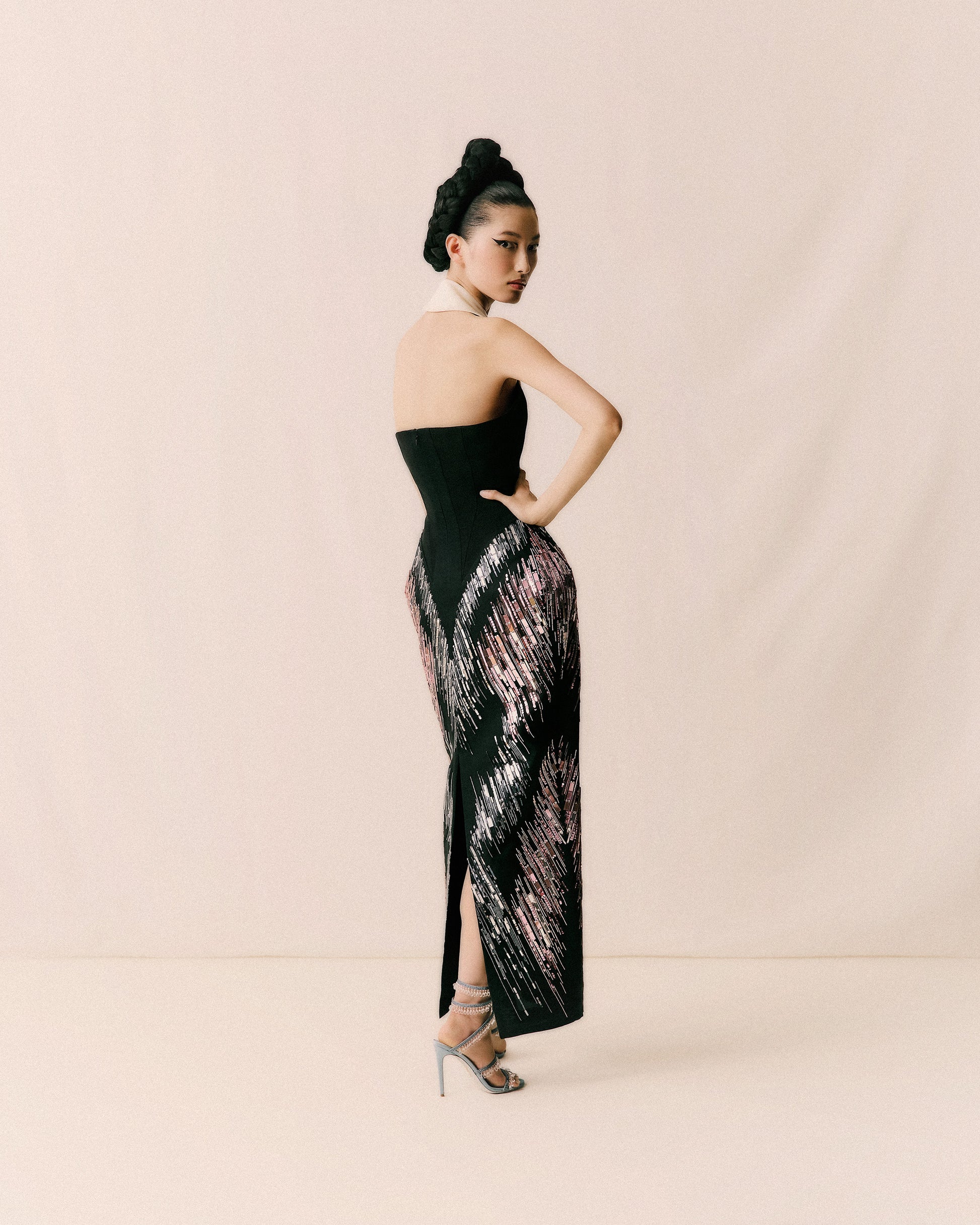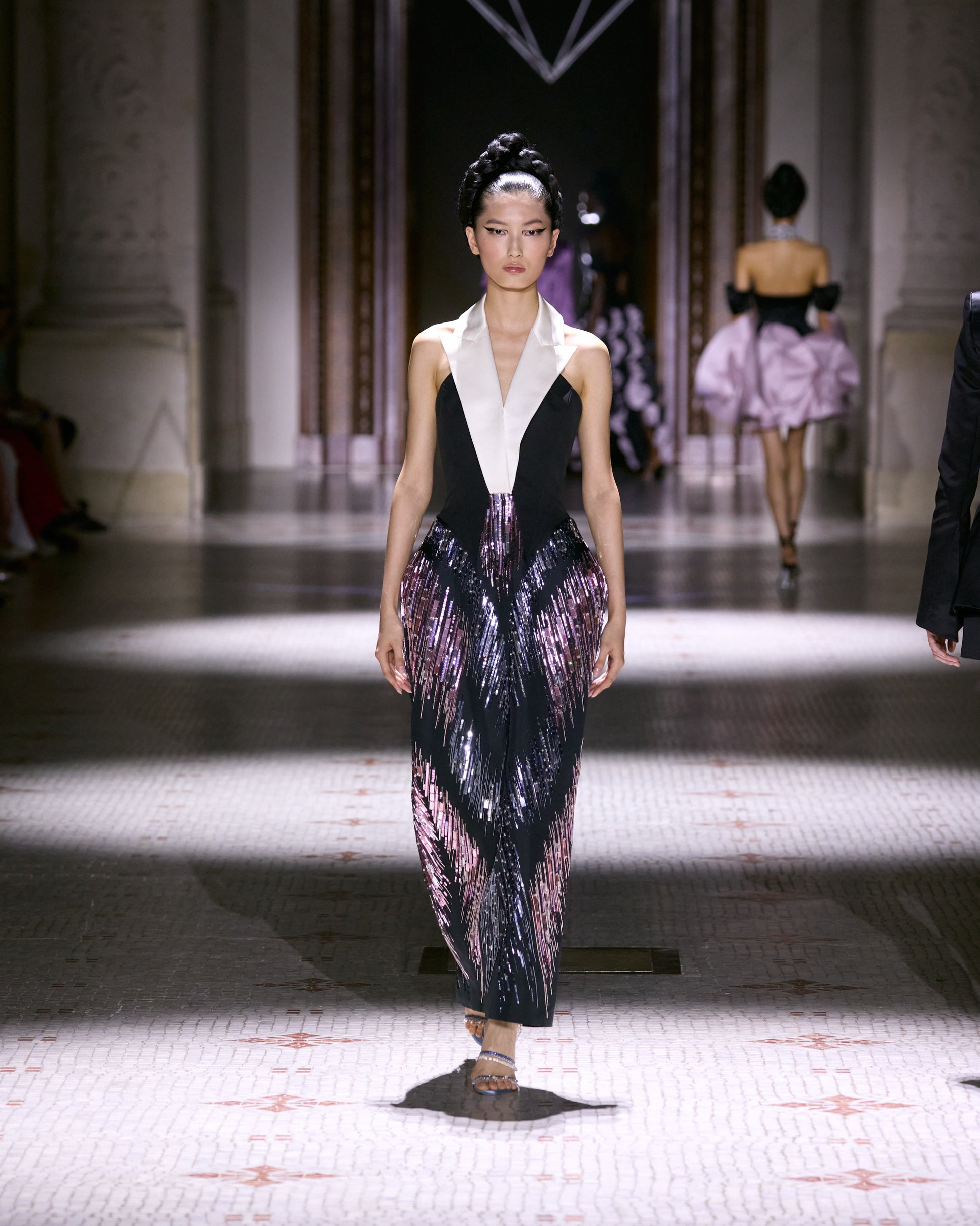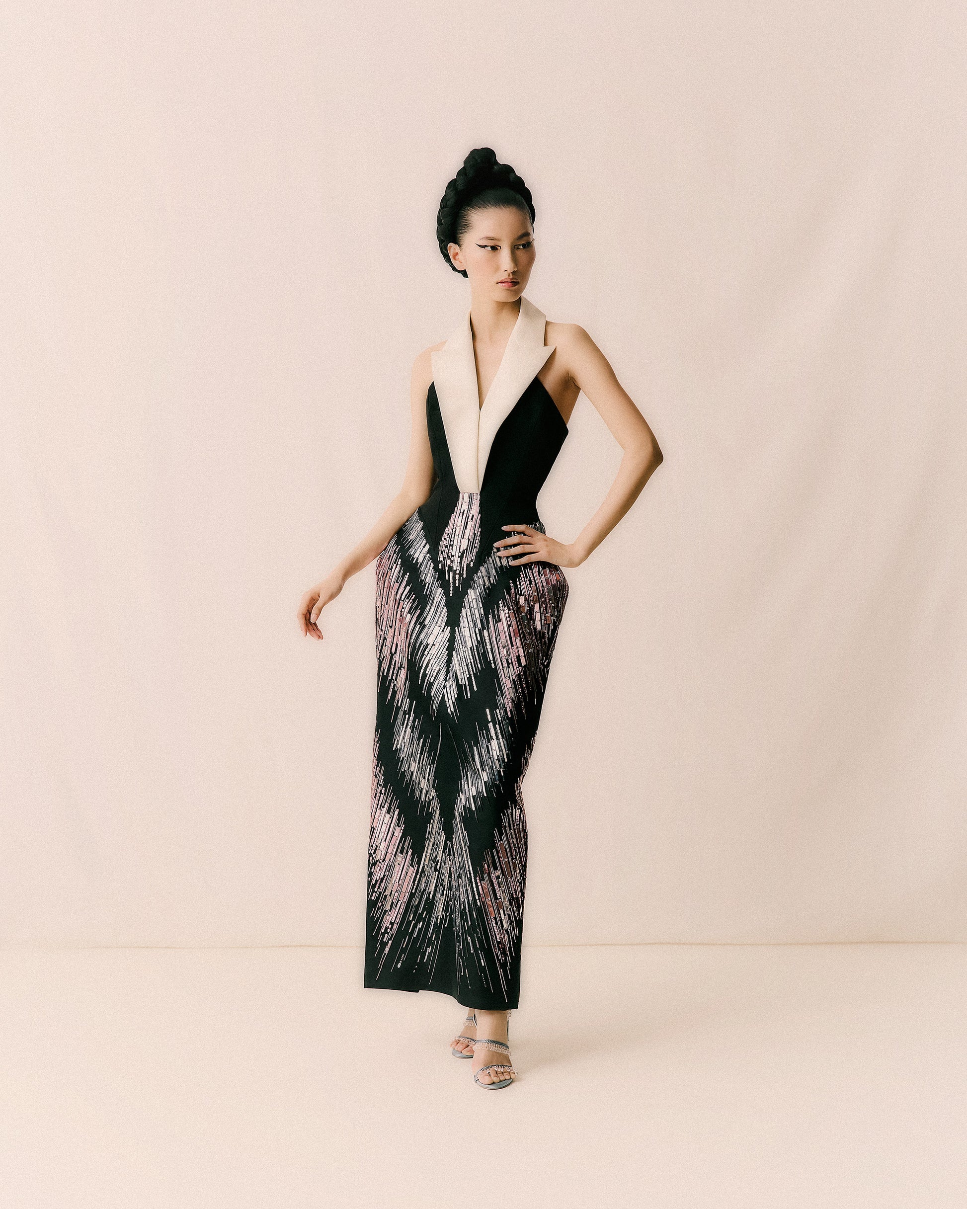 Tailored sleeveless dress with wide lapels and a strong silhouette, with rhomboid insets the hips. The bodice is in heavy organic silk faille, with a contrasting collar. The skirt is made in silk triple organza with an A-shaped motif, entirely hand-embroidered with pink and silver dégradé sequins and glass beads, exploring directional light and shadow.
