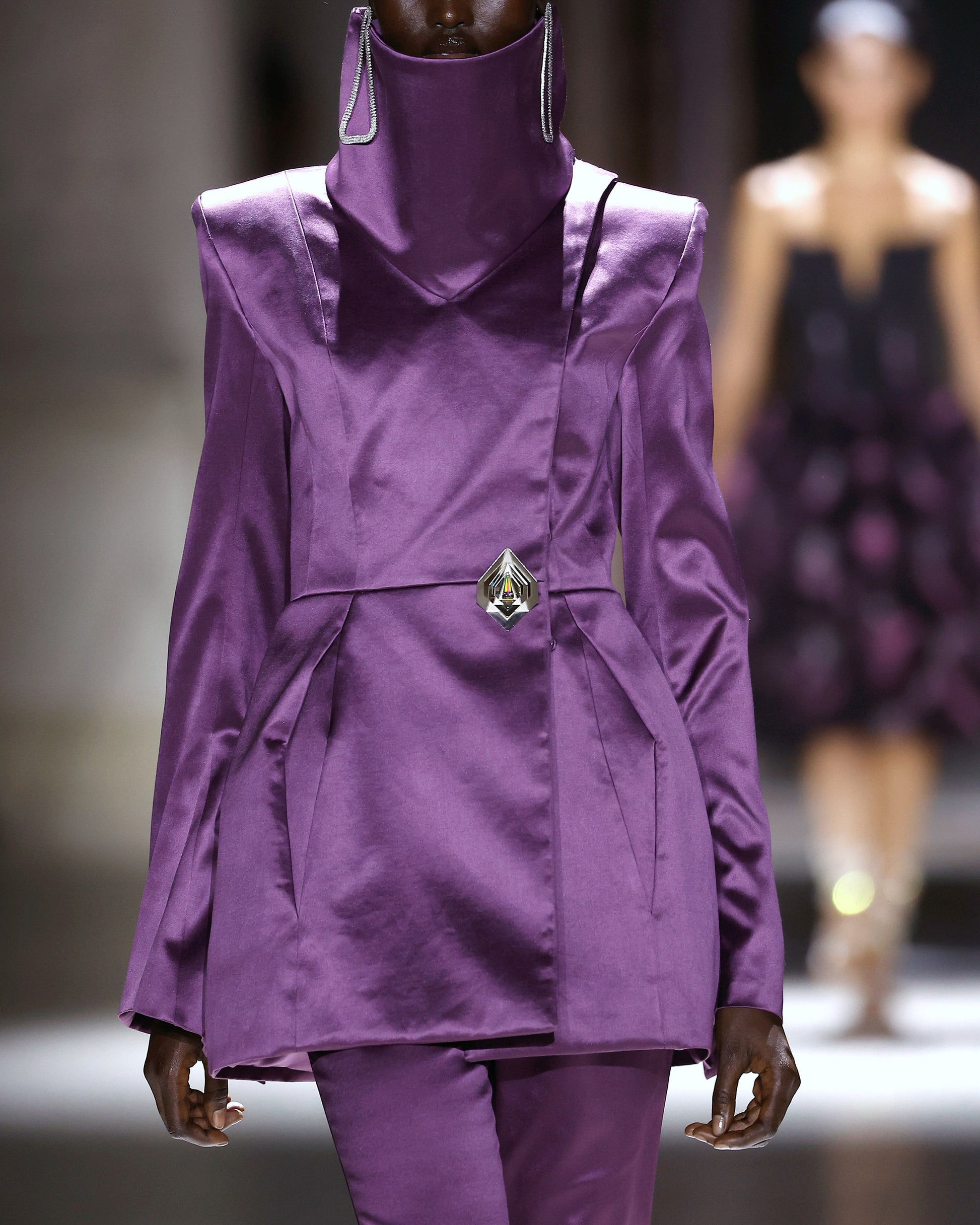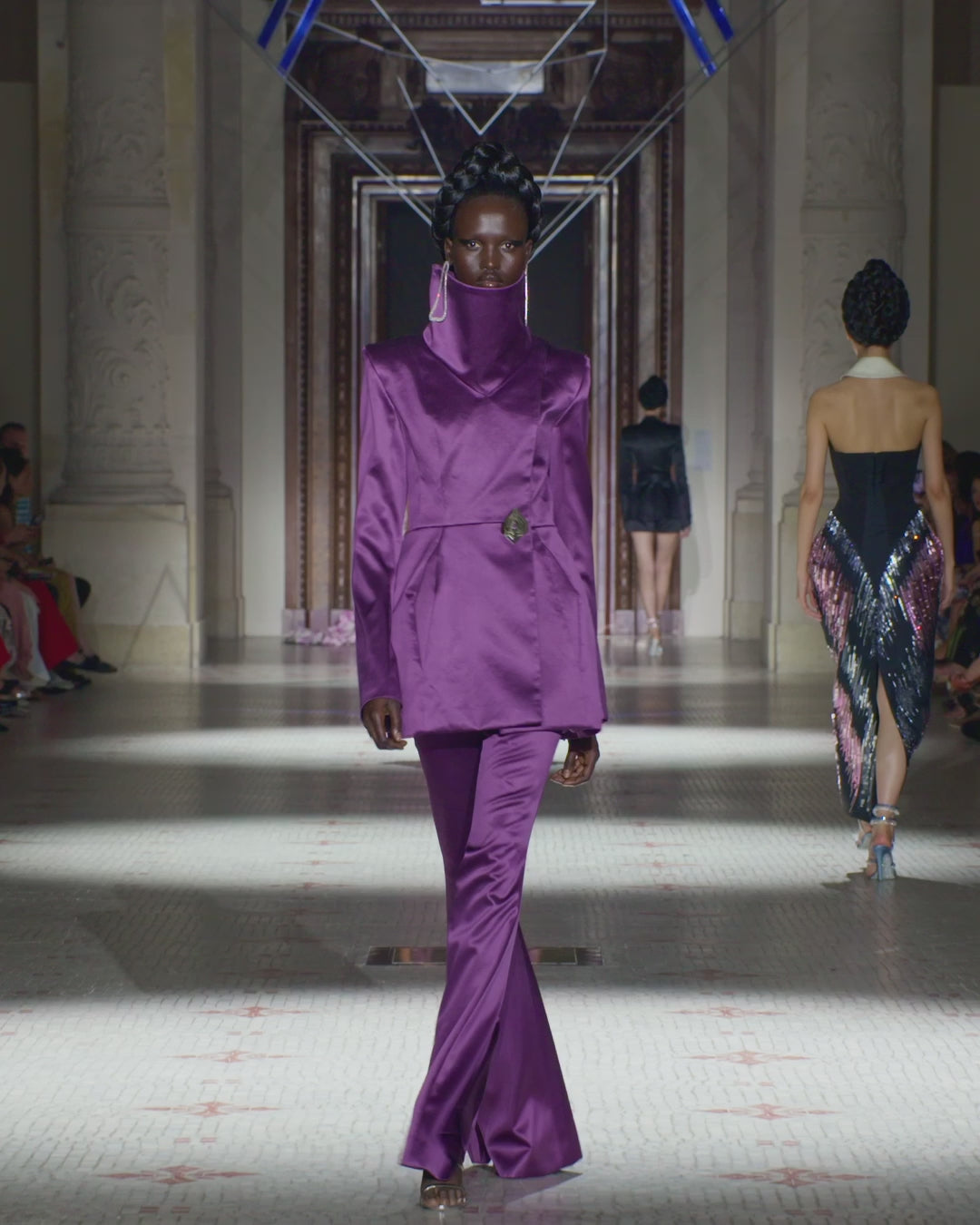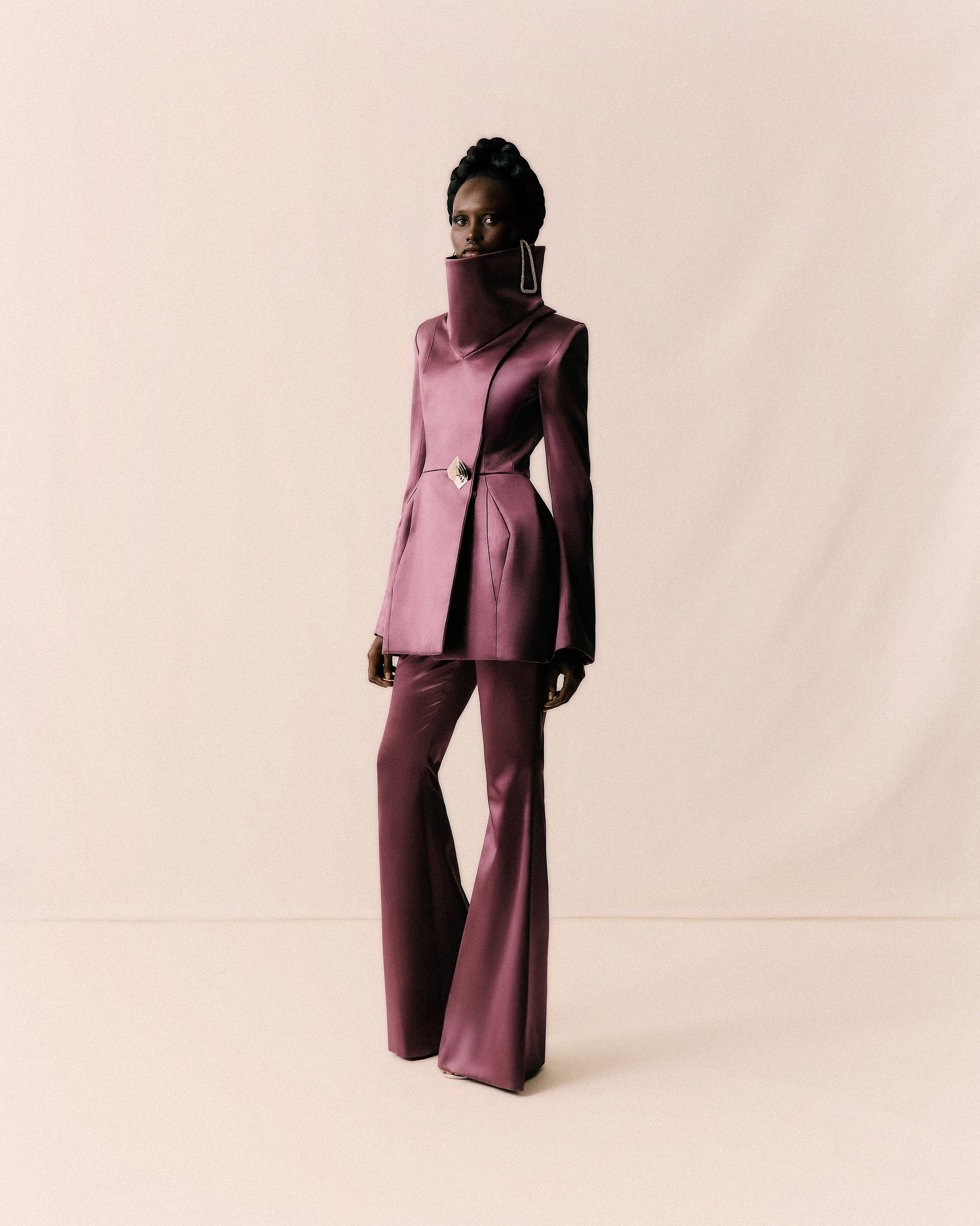 Double-breasted suit in GOTS-certified organic silk (Organic, certified by Ecocert Greenlife 257263). The jacket features angular cuts, with sharp lines, a fitted waist, and volume around the hips. The fluid sleeves are flared, and a high collar sets the style of this piece. The jacket is worn with flared trousers made in the same satin