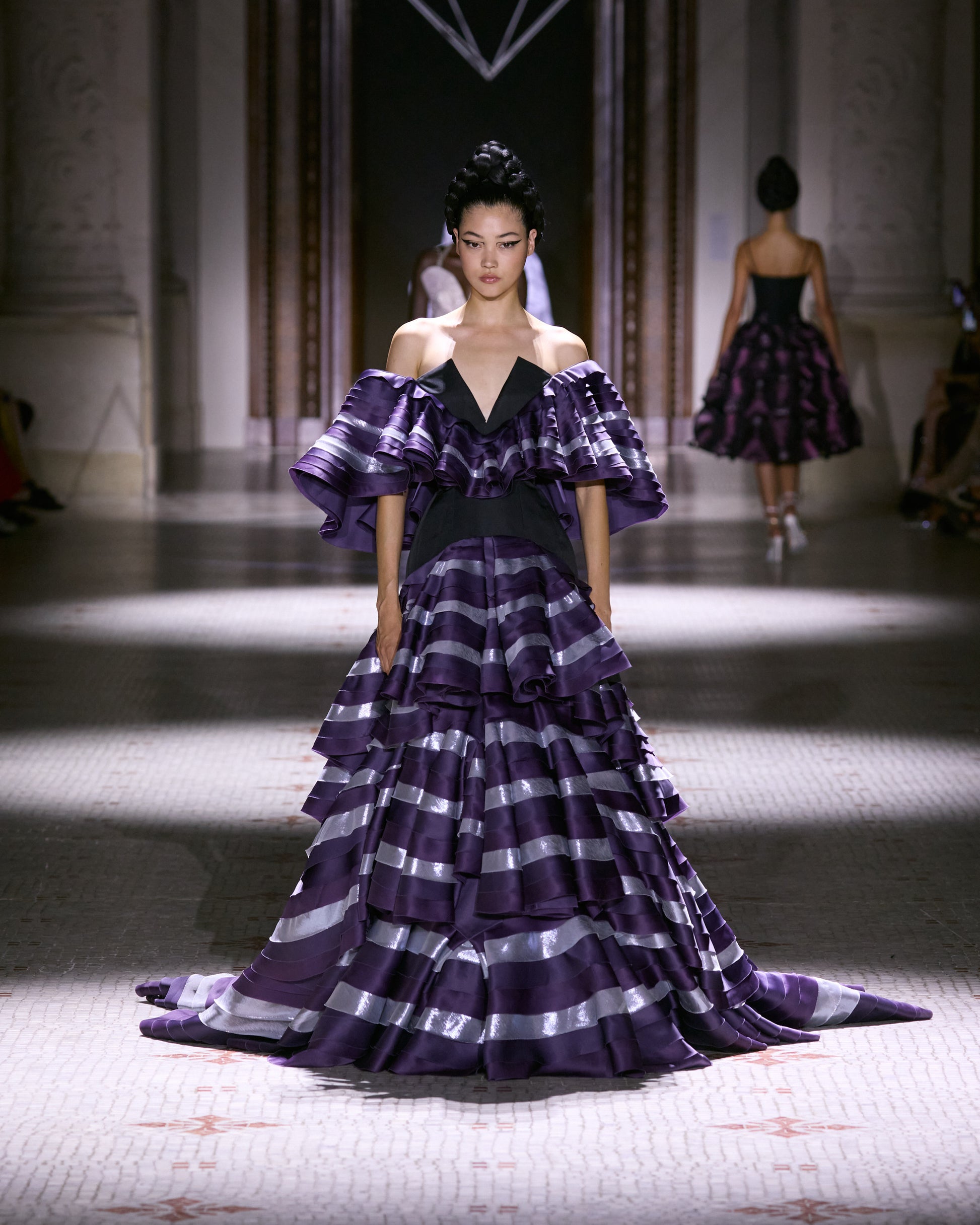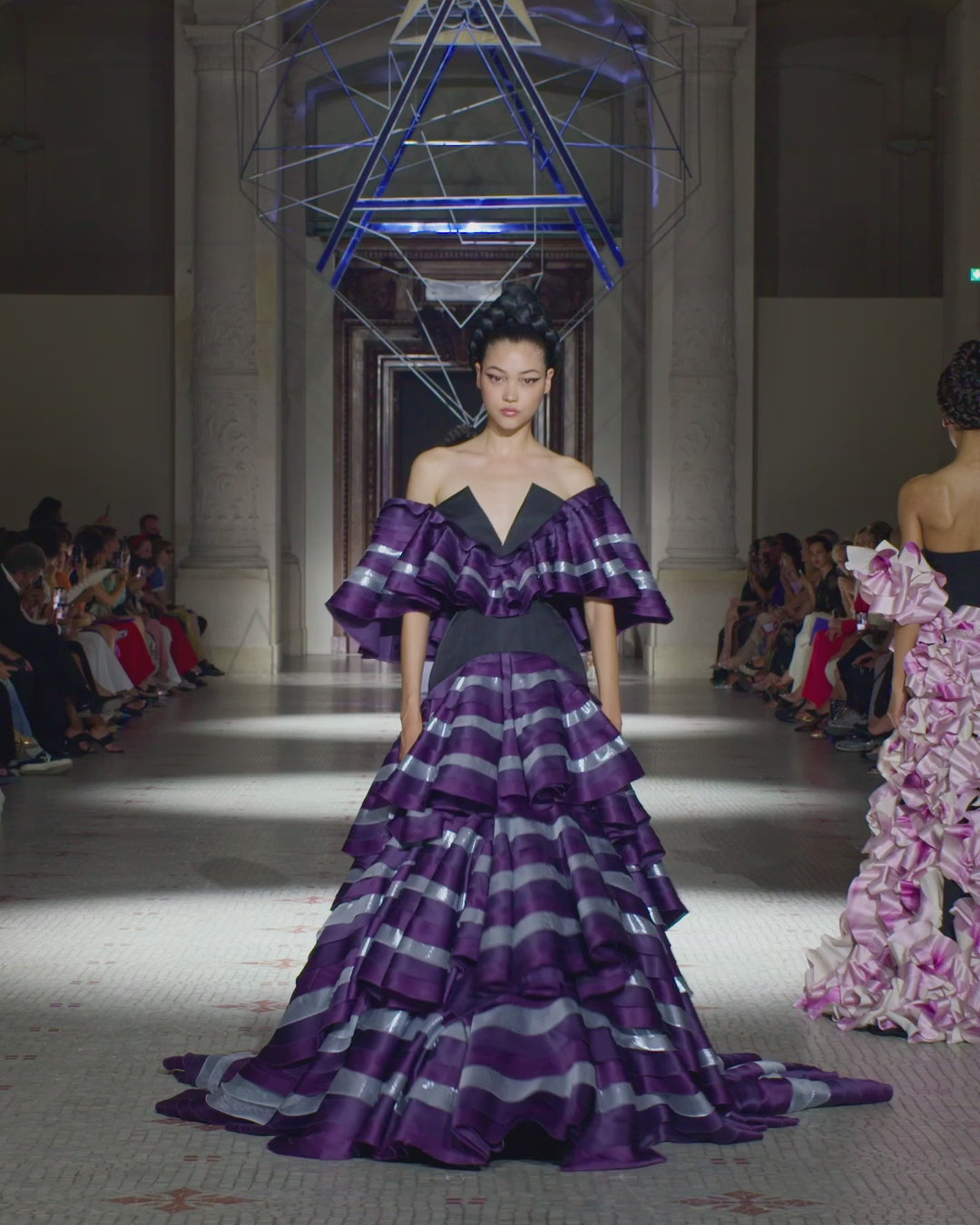 800 hours and 400 metres of silk organza bias ribbons went into this long organic silk peau de soie gown with its mathematical play of lines and colours wrapping around the body and expanding, and detailed folded biased ribbons and volumes around the arms and the skirt.