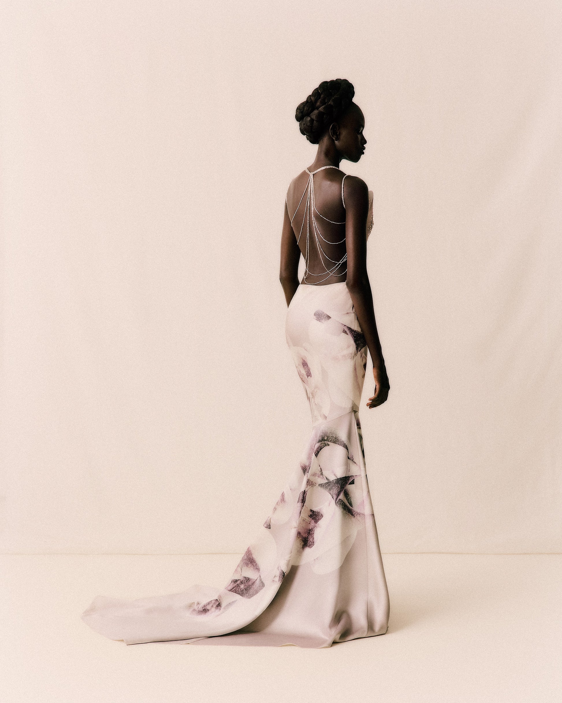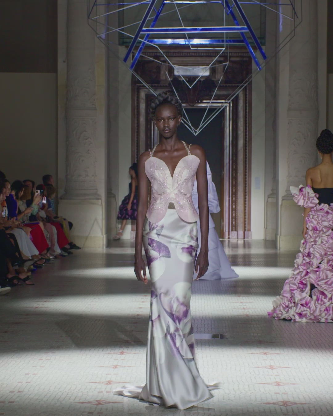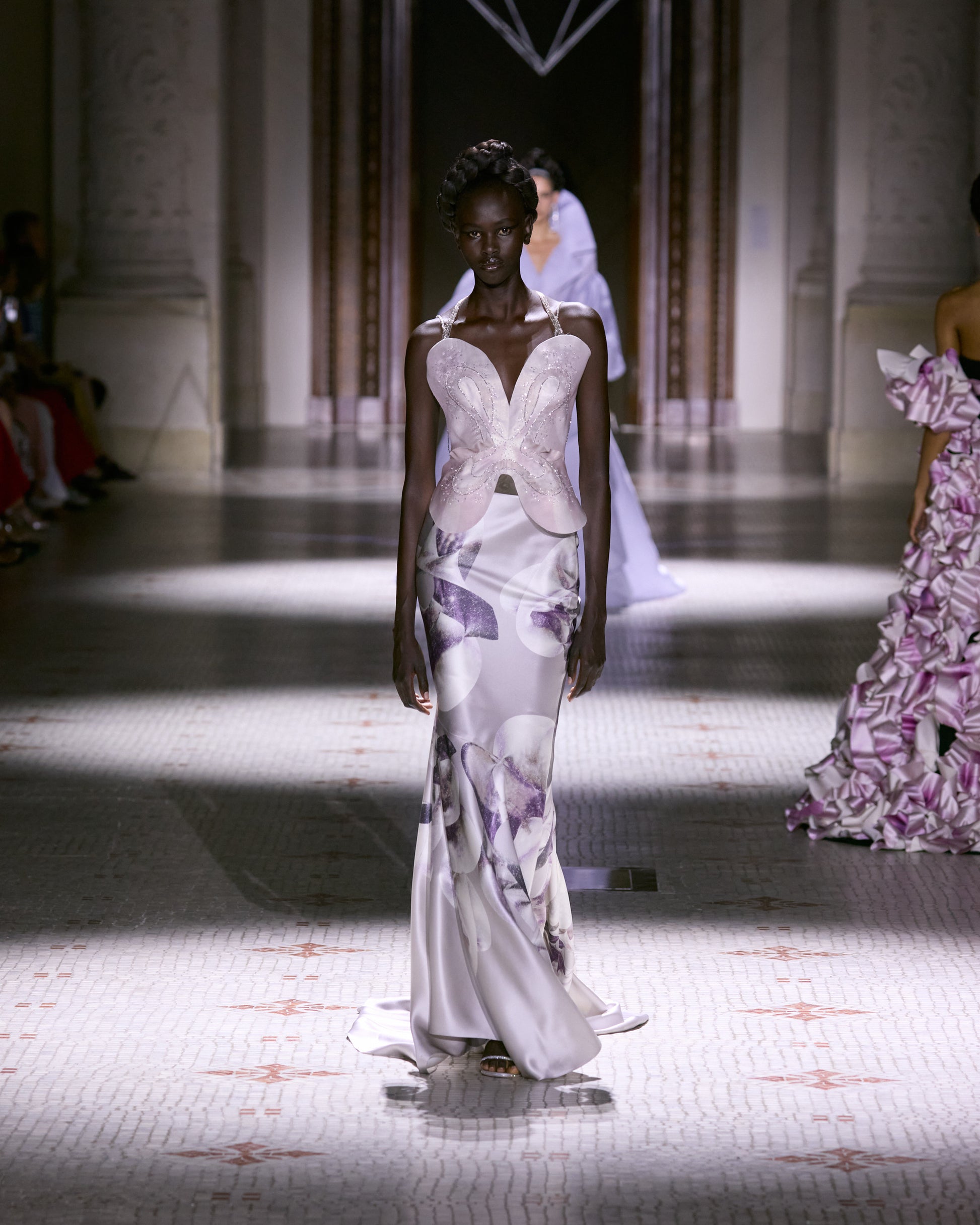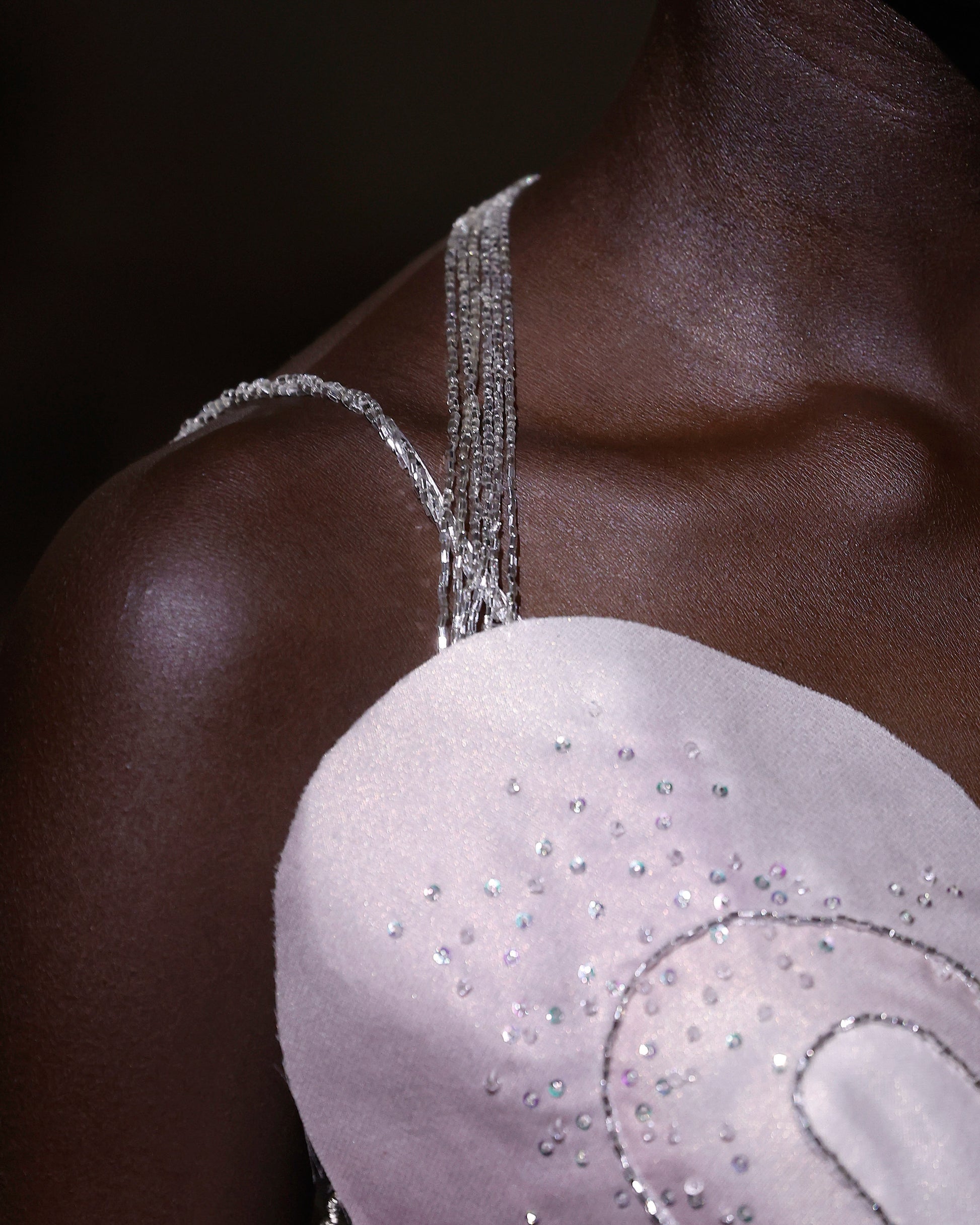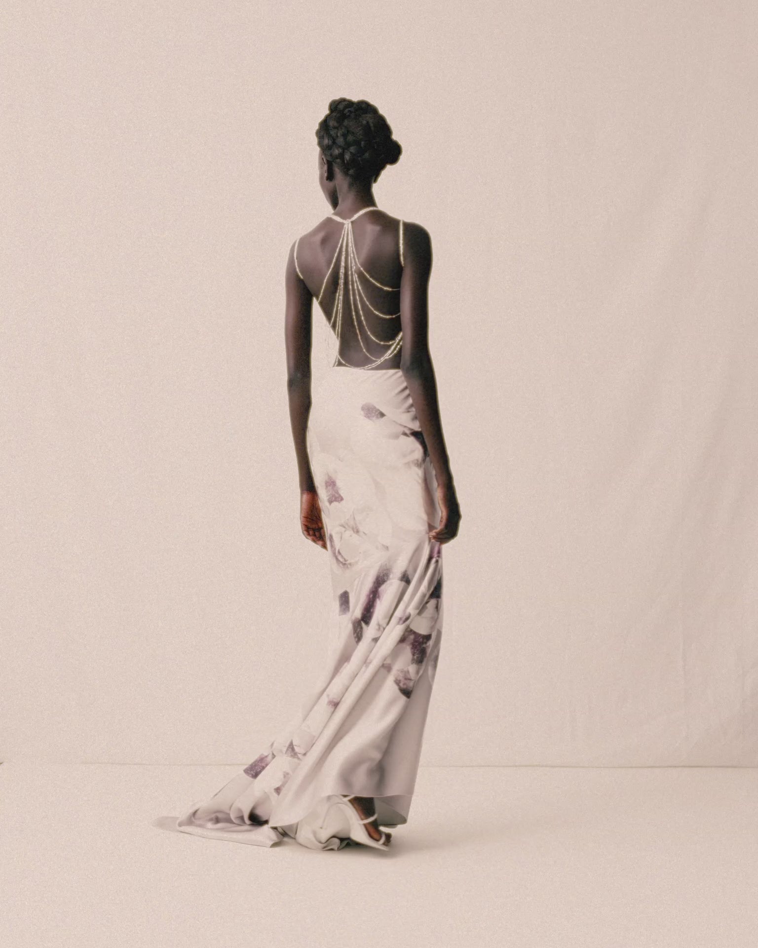 A voluminous ensemble emanating from the hidden dimensions of Calabi–Yau. The asymmetrical, GOTS-certified (Organic, certified by Ecocert Greenlife 257263) skirt in printed, bias-cut organic double silk is paired with an organza and overprinted foil top with straps hand-embroidered beaded straps at the back. The top is also embroidered with glass beads and ‘stardust’ sequins.