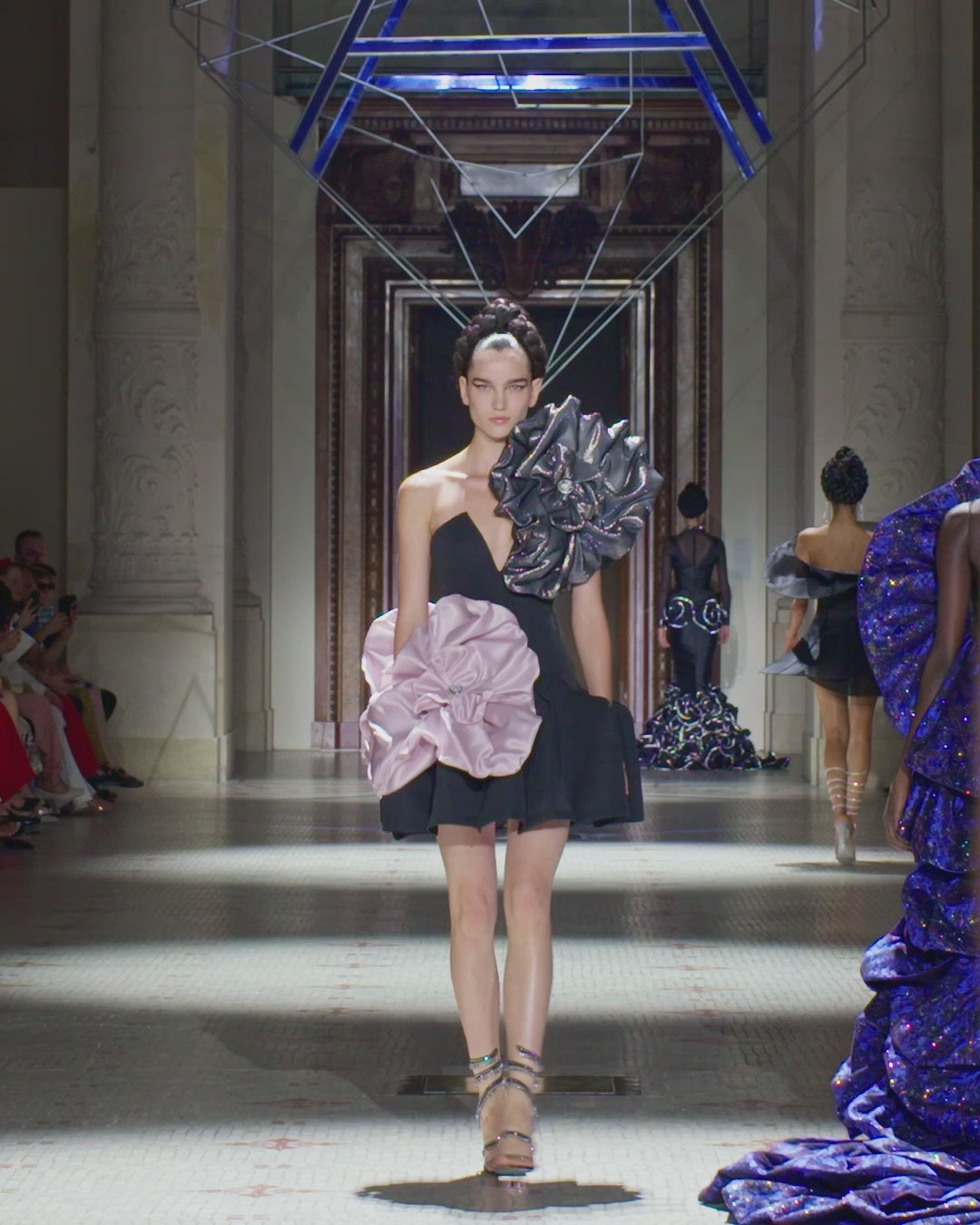 Short cocktail dress in heavy organic silk faille, with an inverted A-shaped décolleté. The skirt explores hidden spaces through mathematical pleats that create a circular volume. The asymmetric silhouette is formed by four sculptural floral shapes cut from silk organza and silk lamé, referencing the multi-dimensional properties of Calabi–Yau and adding volume at the shoulder and reversed hip. The floral shapes feature hand-embroidered details in the centre, interpretations of the ArdAzAei emblem.