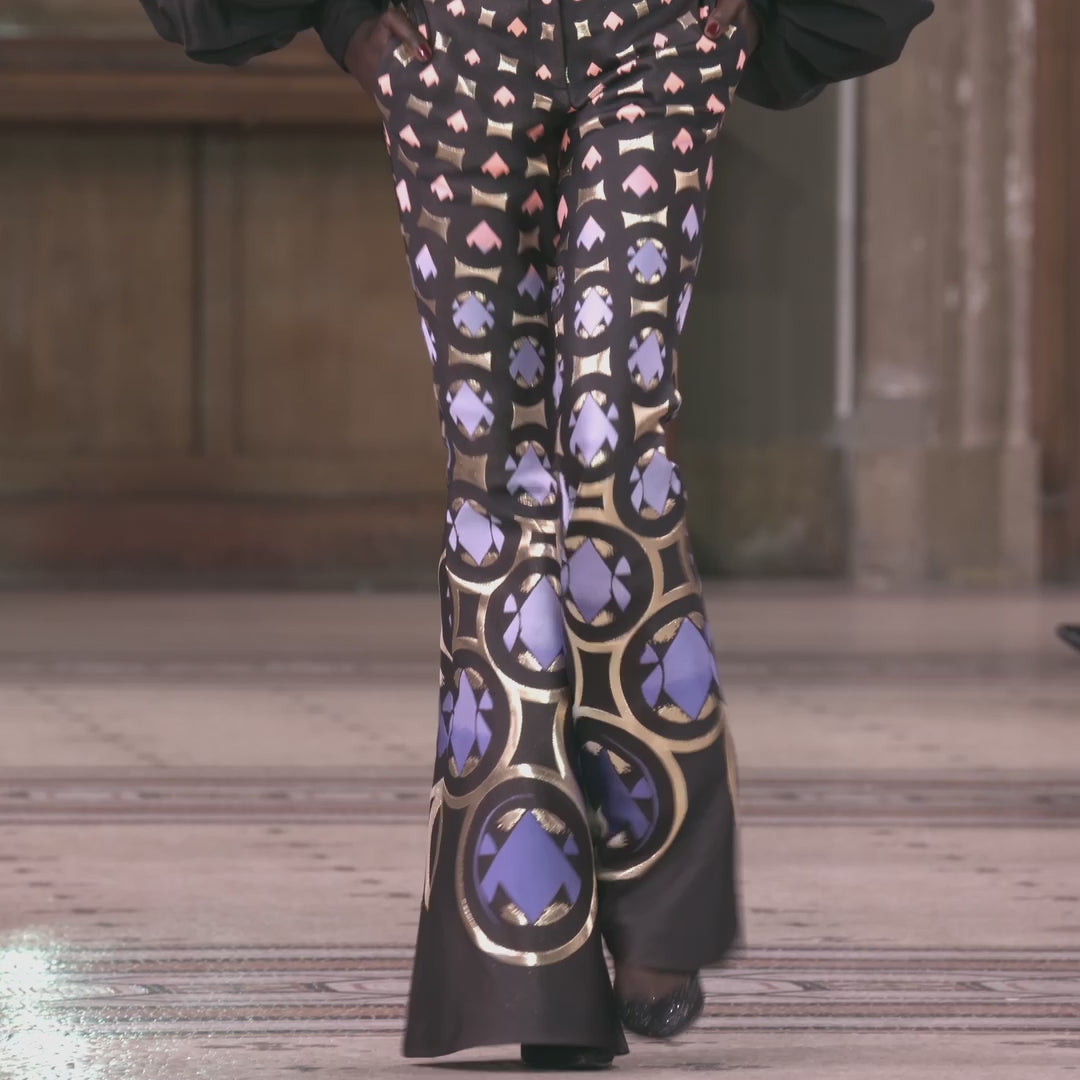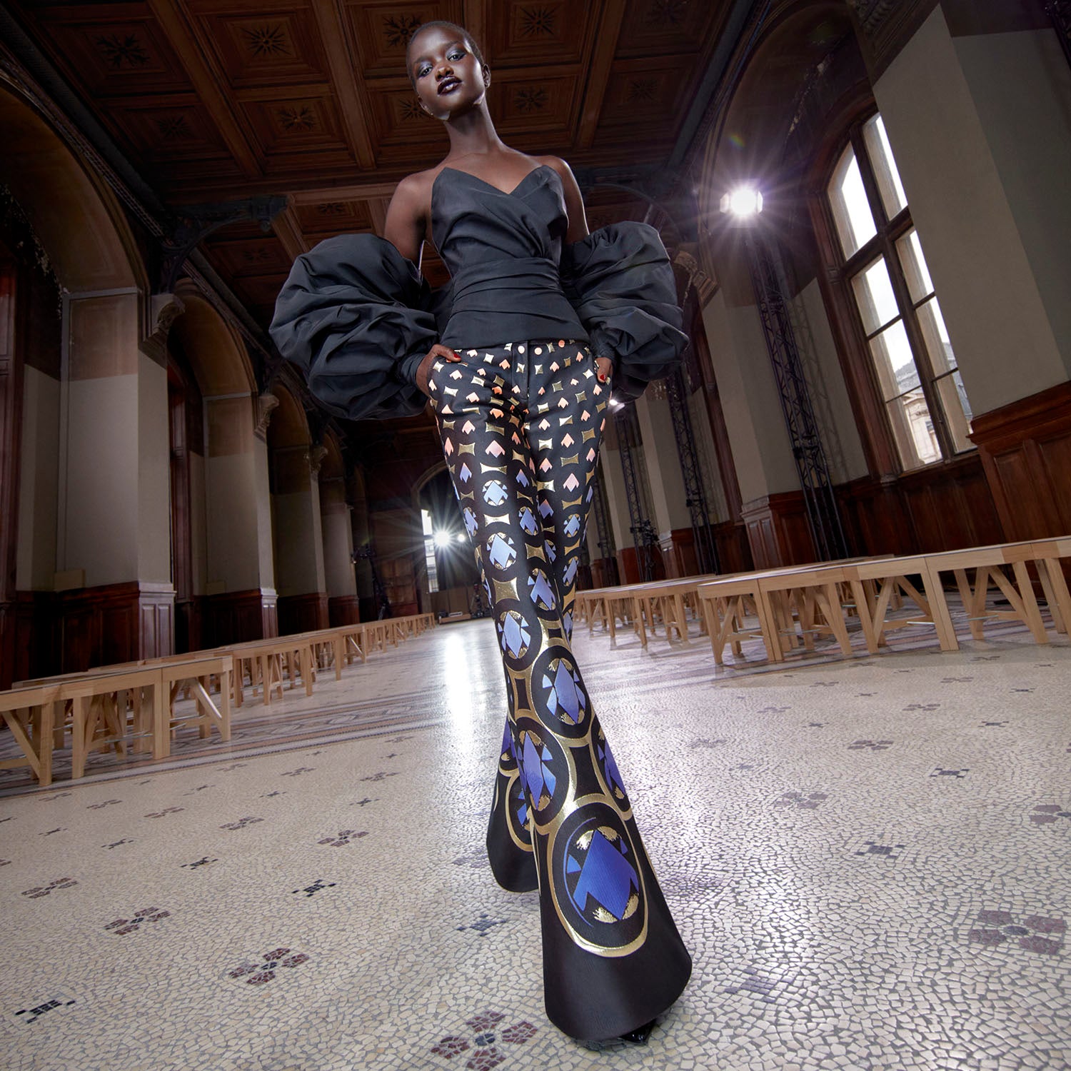 A two-piece look with bold expression, the bustier top has A-shaped points, draped pleats and a wrap-over construction. ◊ It is highlighted by an oversized bow at the back and detached voluminous sleeves with pleated details, all crafted in silk faille. ◊ Paired with slim fit and flared trousers, elevated by a silk-blend jacquard. ◊ The fabric features elements of the ArdAzAei logo abstracted to appear as dégradé pattern with in terlaced metal threads.