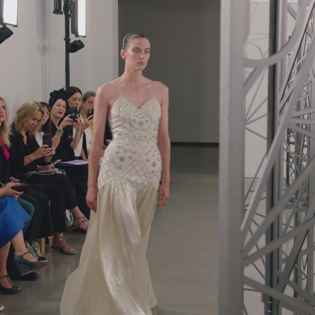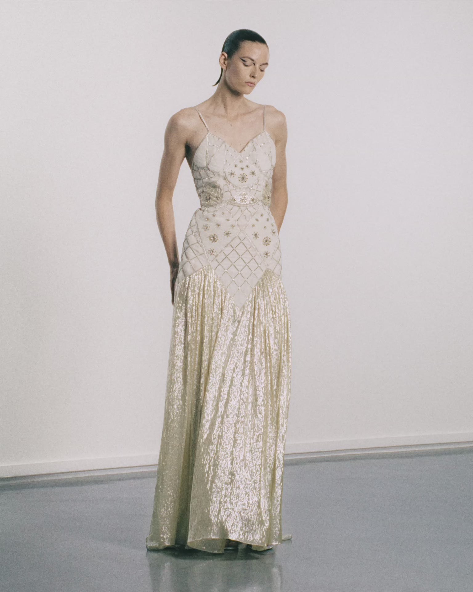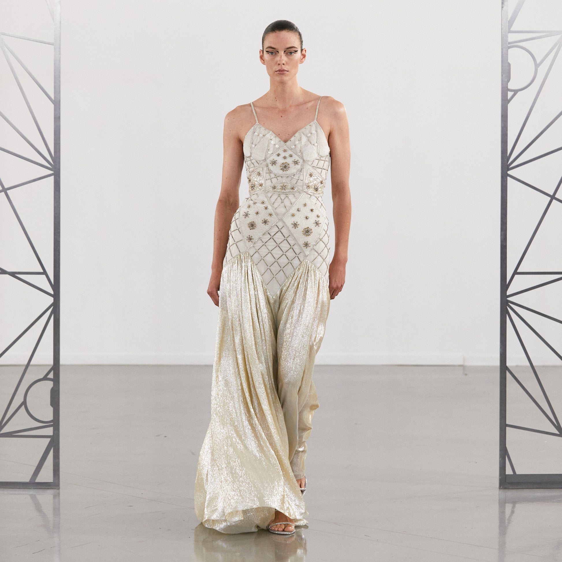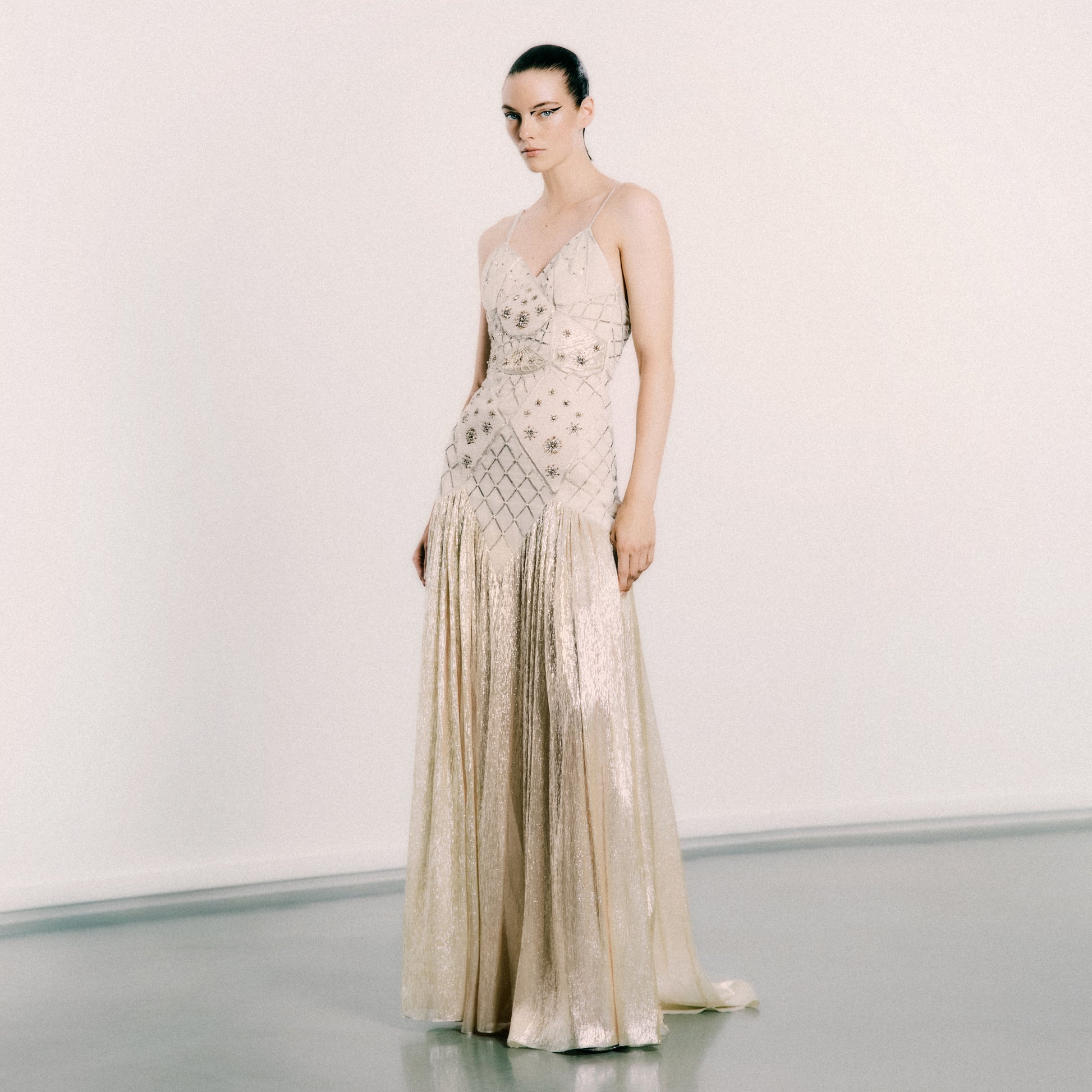 Crafted from sheer silk and adorned with embroidery, the top of this gown serves as a canvas for a display of different textile techniques. ◊ A combination of fine plissé silk, appliqué techniques, and an interplay of beadwork, sequins, and metallic threads creates a tapestry of textures and materials, casting a play of light that enhances the dress' allure. ◊ Inspired by the ornamental ceilings of Yazd, the embroidery motif pays homage to the resplendent architecture of Persian design. ◊ The tailored bustier top of the dress is designed to embrace the body, accentuating natural curves. ◊ A full-length fluid skirt in lightweight silk lurex evokes the sense of fluid movement..