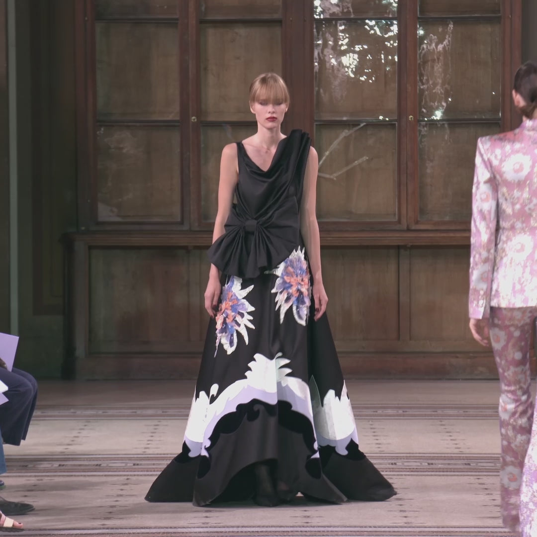 An opulent evening gown featuring an organic drape of the top, shaped by pleats, and flared volume of the skirt. ◊ The gown reveals an open back and features a magnified bow at the waist. ◊ The full skirt is embellished with an appliquéd motif along the hem in silk velvet and silk crepe, and two delicately hand-embroidered flowers made in fine silks and beading on a silk velvet base.