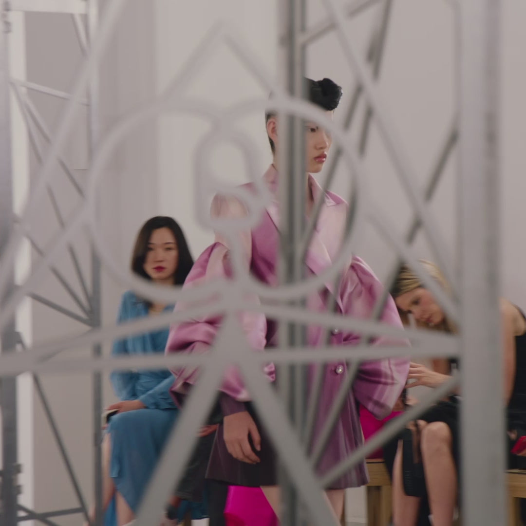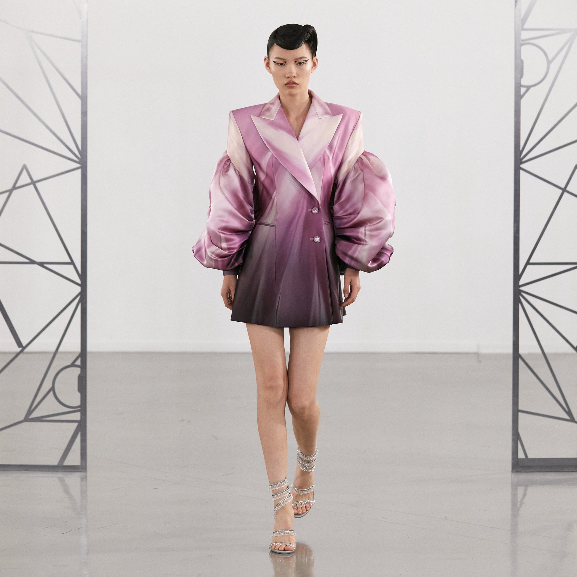 GOTS-certified tailored minidress (organic, certified by Ecocert Greenlife 257263), with voluminous sleeves, wide lapels and strong shoulders. ◊ The double-breasted dress is made in heavy organic silk satin duchesse, with a custom printed motif, made using GOTS-certified colours and processes. ◊ The diffraction of light is the print’s point of reference, with rays radiating on the surface.