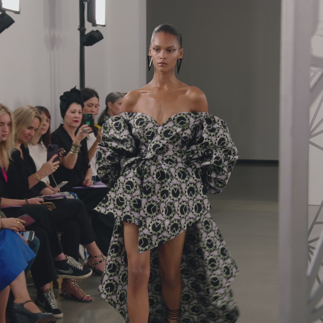 A juxtaposition of asymmetric lines and geometric shapes intertwined with voluminous draping in this gown, crafted from a custom-made jacquard fabric, woven with a blend of silk and organic cotton in Como, Italy. ◊ Drawing inspiration from the perspective of beauty emanating from within, the gown showcases a motif inspired by the intricate atomic structure of the Beryl mineral. ◊ Every detail echoes the ArdAzAei way of seeing. ◊ Adding to its allure, the gown is adorned with a long train cut in a geometric shape.