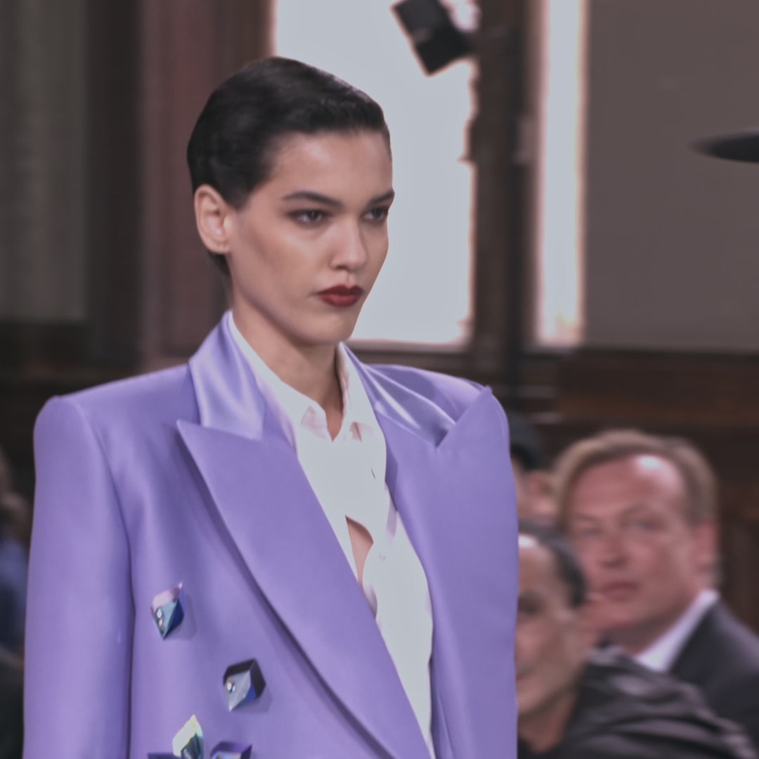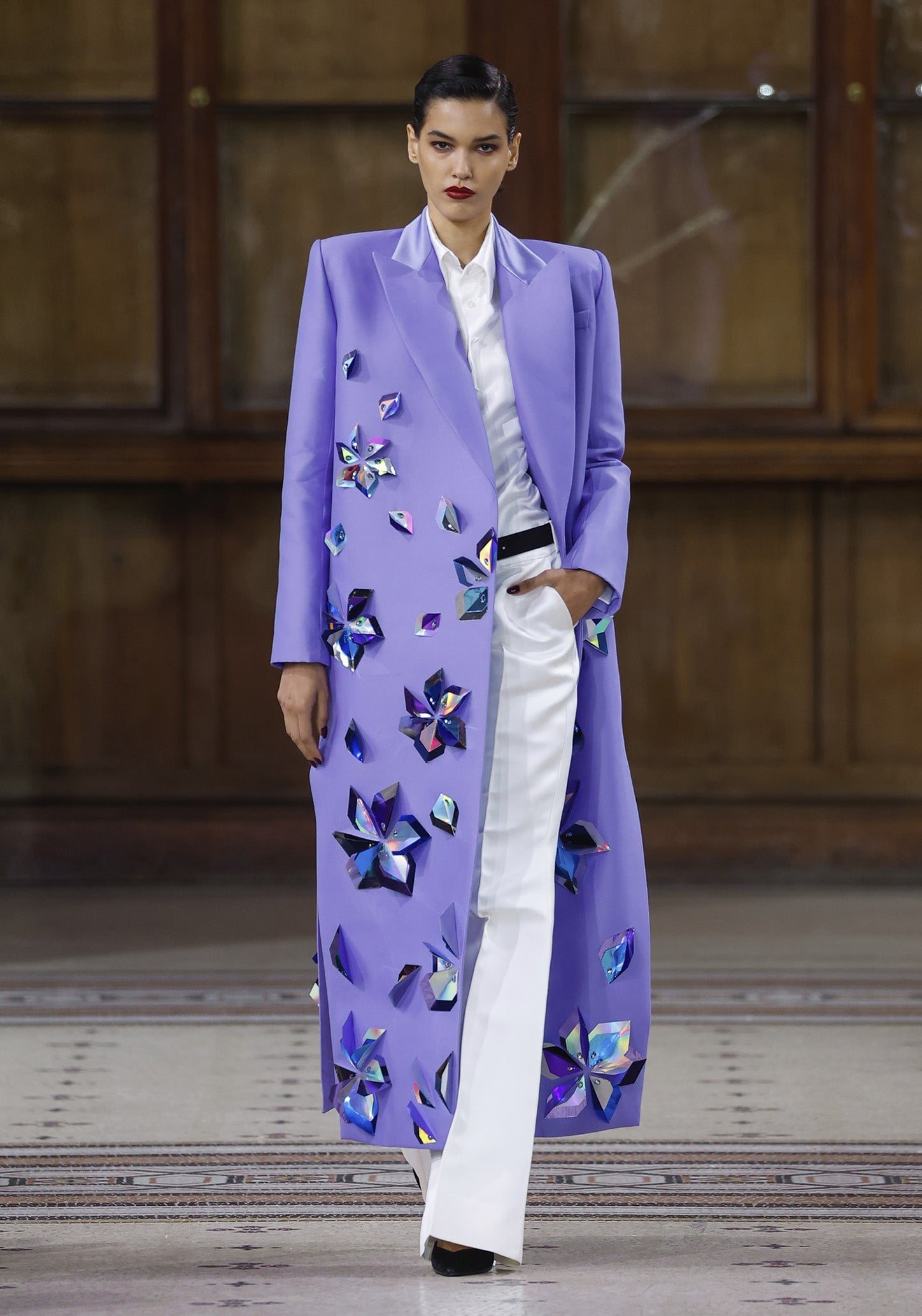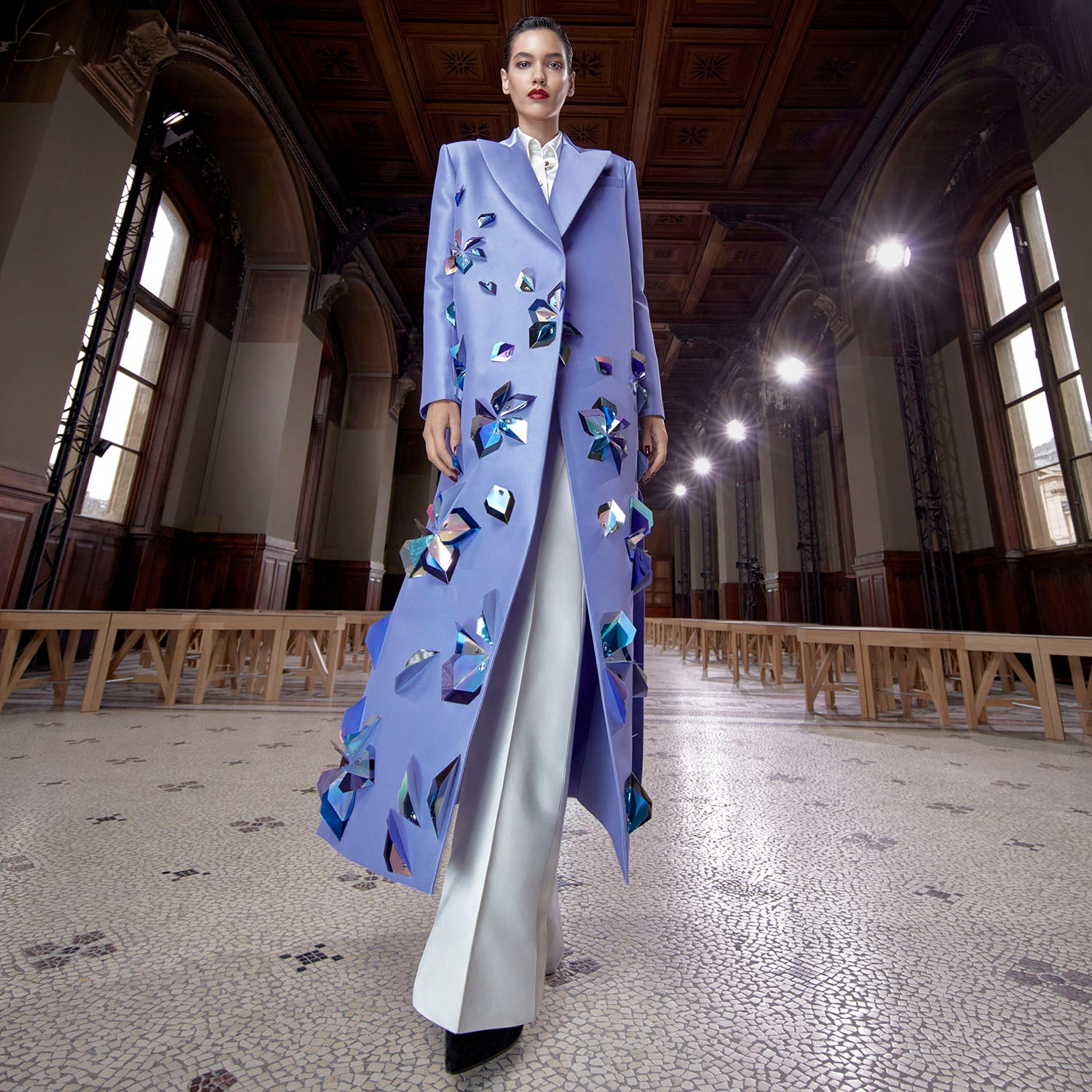 An embellished overcoat featuring a straight silhouette with slits on the sides and strong shoulders, crafted in a structural silk and wool blend ottoman weave. ◊ The coat is embellished with special-cut ArdAzAei magnified sequins in recycled material and light-reflecting Swarovski crystals. ◊ The sequins and crystals are hand-embroidered by skilled artisans in a degradé pattern. ◊ The look is completed with shirt in soft silk double satin and low-waisted men's style press-creased trousers in heavy silk double satin.