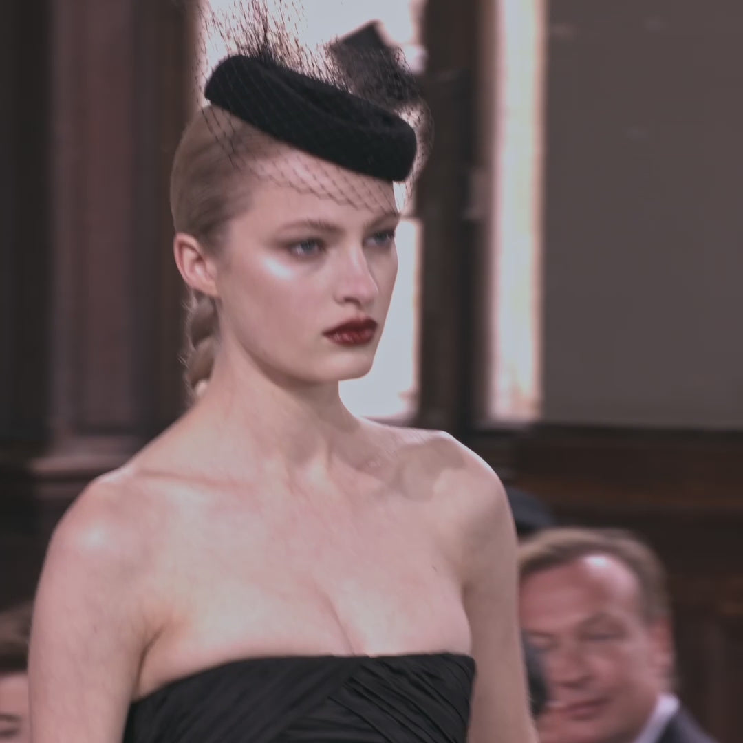A sophisticated exploration of lines and pleated texture in this full-length evening gown made by skilled couture artisans in Paris. ◊ The body-hugging top is crafted in densely pleated silk duchesse, cut in contrasting directions across the body. ◊ The dress is finished by a two-tiered ruffled asymmetric skirt, adding volume and movement to the silhouette.