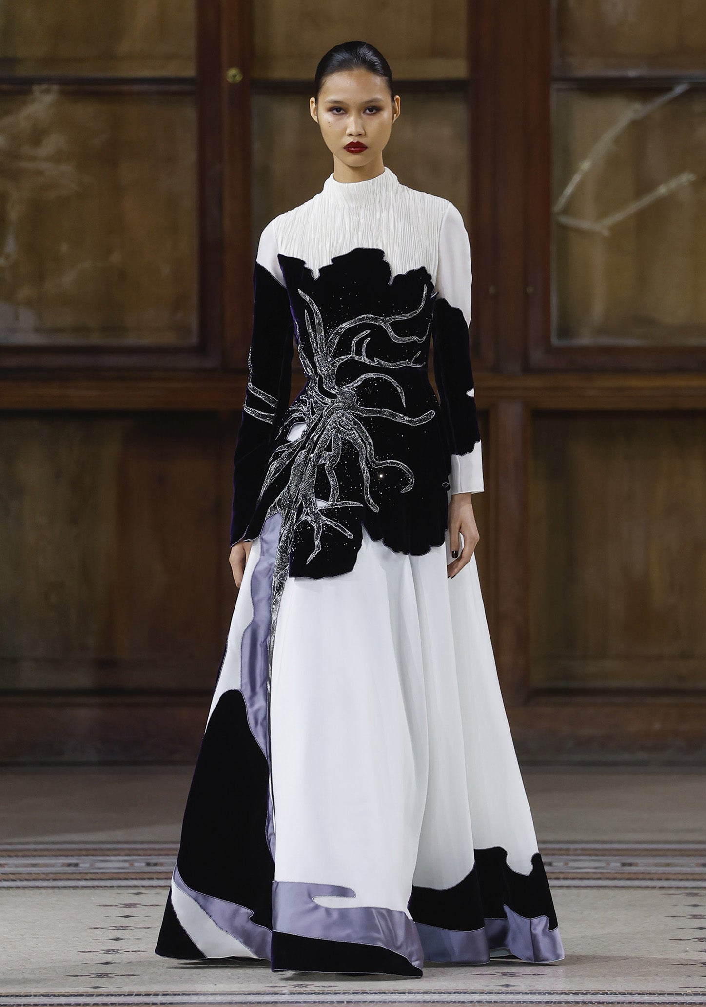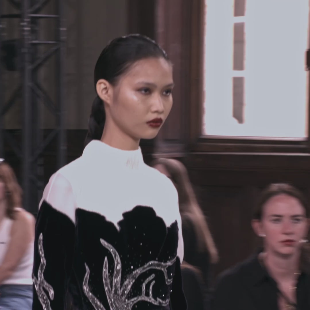 A delicately crafted evening gown made in refined textile techniques. ◊ The serene silhouette with accentuated waist features a top made of silk georgette in dense Fortuny pleats. ◊ The bustier and skirt in silk organza is elevated by a large appliquéd motif in silk velvet and satin, all joined by decorative metallic stitches. ◊ Branches of finely smocked silk lamé decorates the motif, just as sprinkled hand-embroidered metallic beads.