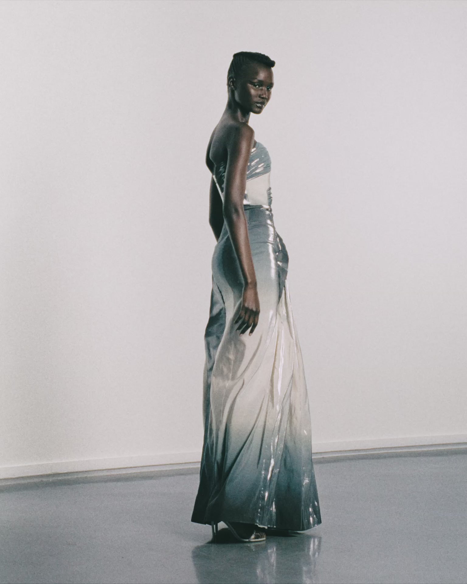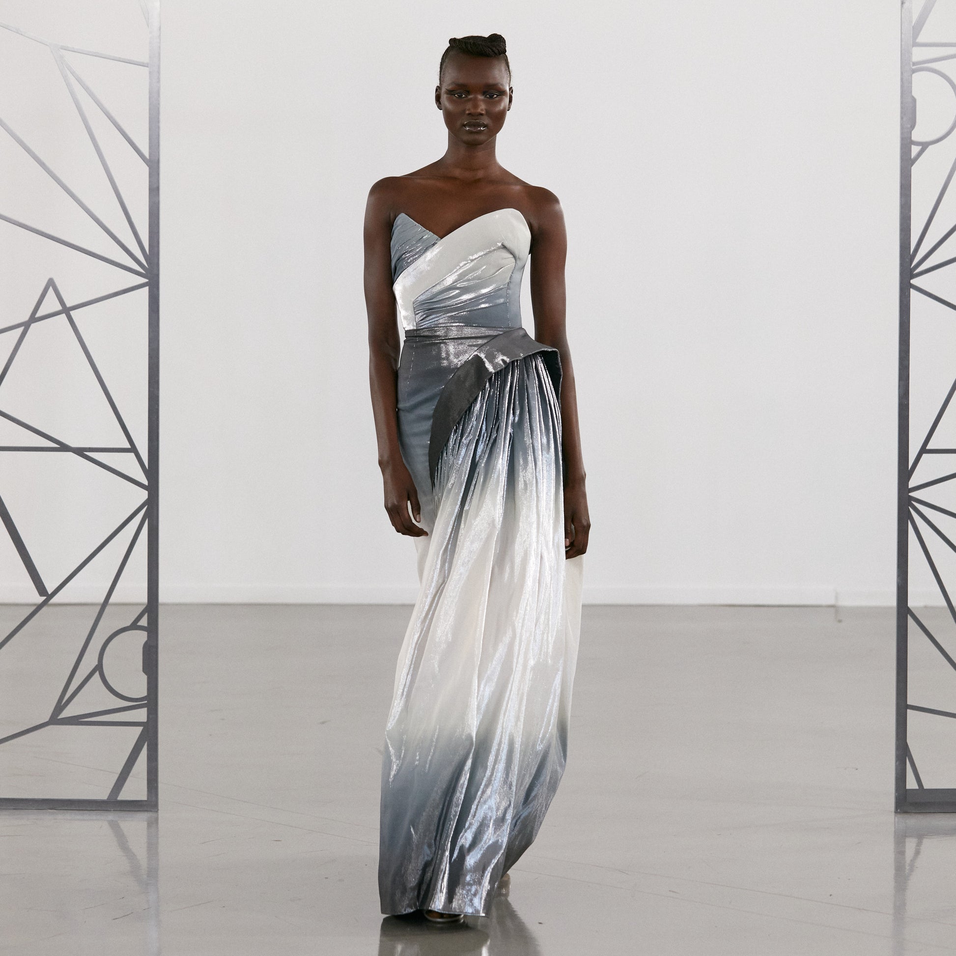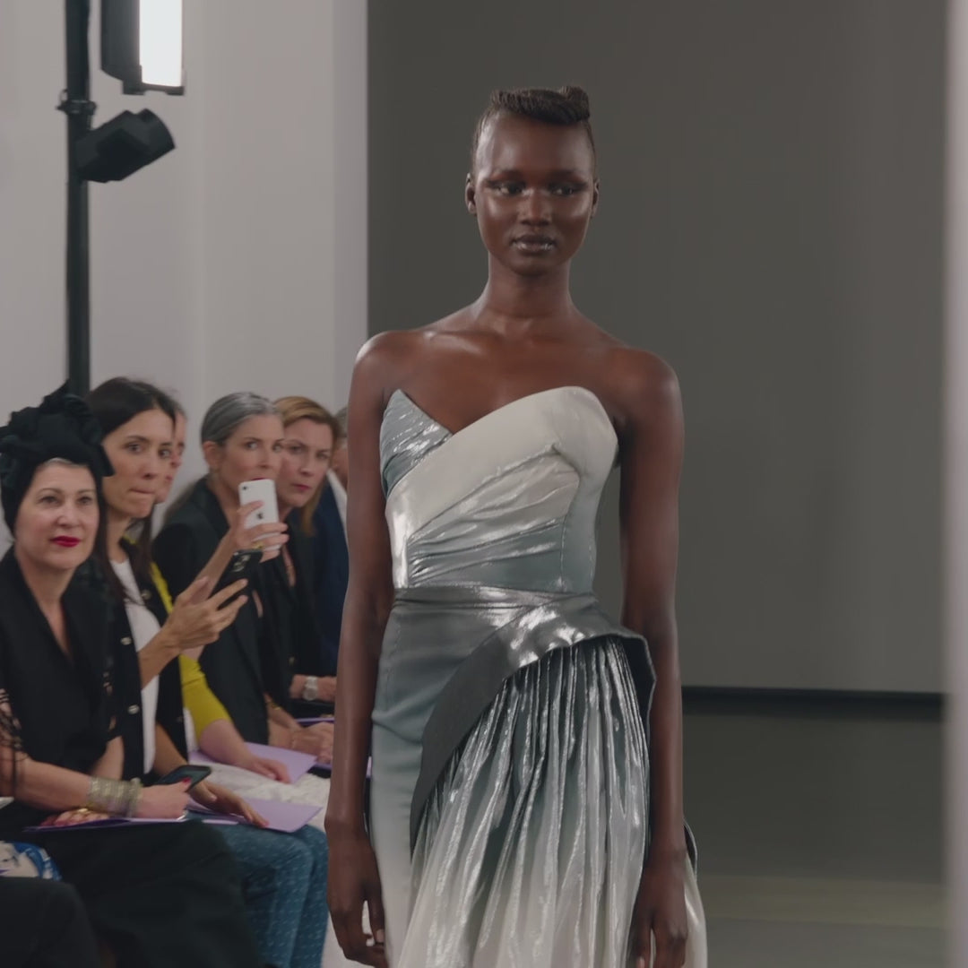 Asymmetric bustier dress featuring a play of light and shadow, in contrasting pleated and graphic cut panels. ◊ The full-length skirt has a straight-cut pencil silhouette, opening up into volumes of gathered fabric on the left side. ◊ The dress is crafted in a degradé jacquard with a metallic silver surface: the Italian silk blend fabric is woven with an intricate technique to create a soft degradé, where the warp yarns are dyed in a range of grey hues before being carefully placed in the loom. ◊ The metal lurex weft gives the weave its reflecting exterior.