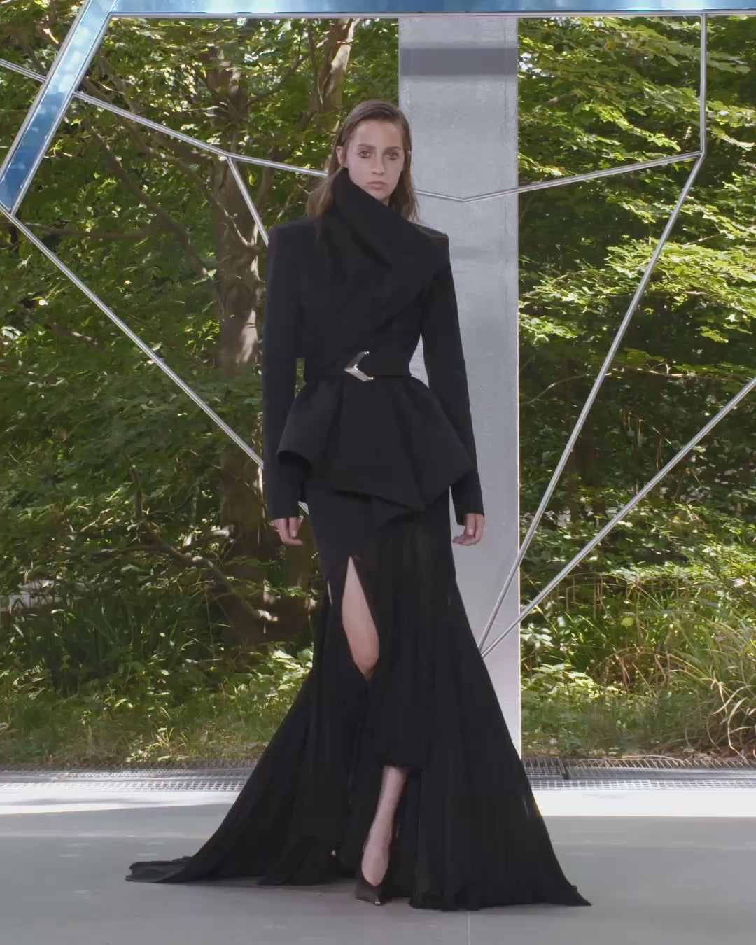 Cut from a dynamic cotton twill, the front sees draping rise above the neck, and the folds of its back form the initial ‘A’. The pencil skirt, with voluminous pleated silk georgette godets placed around the hem, flows with movement.