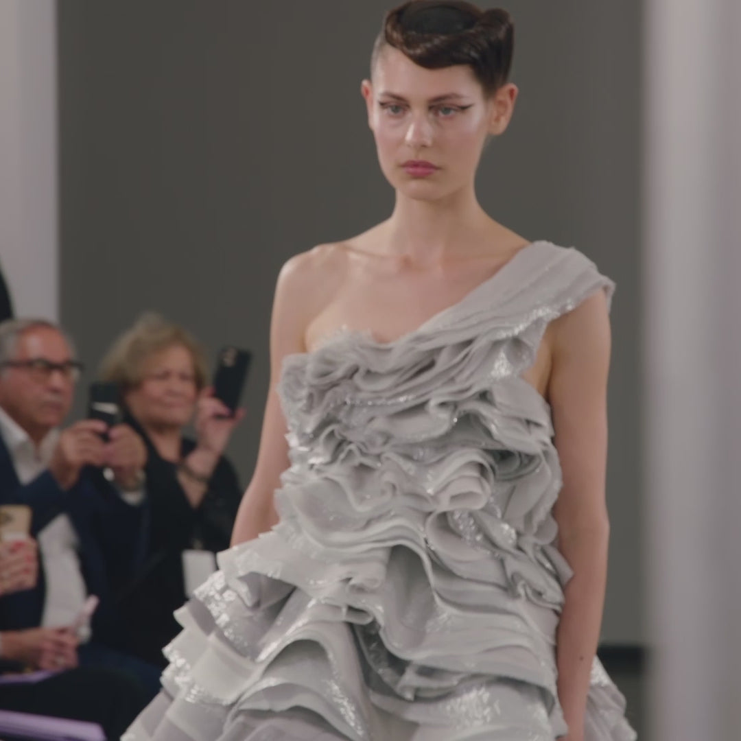 Featuring a one-shoulder bustier top and an asymmetric skirt with structured volume, June is a gown that epitomises the art of textile mastery, with featherlight layers of silk gracefully swirling around the body. ◊ Its silhouette takes form through undulating lines, each adorned with cut layers of delicate silk chiffon, silk organza, and shimmering silver lurex. ◊ Each layer is hand-stitched to the dress, shaping a soft volume. ◊ The dress embodies 850 hours of skilled hands, and the sheer magnitude of this dress is reflected in the abundance of silk used, with an impressive 200 metres of silk coming together to create its sumptuous texture.