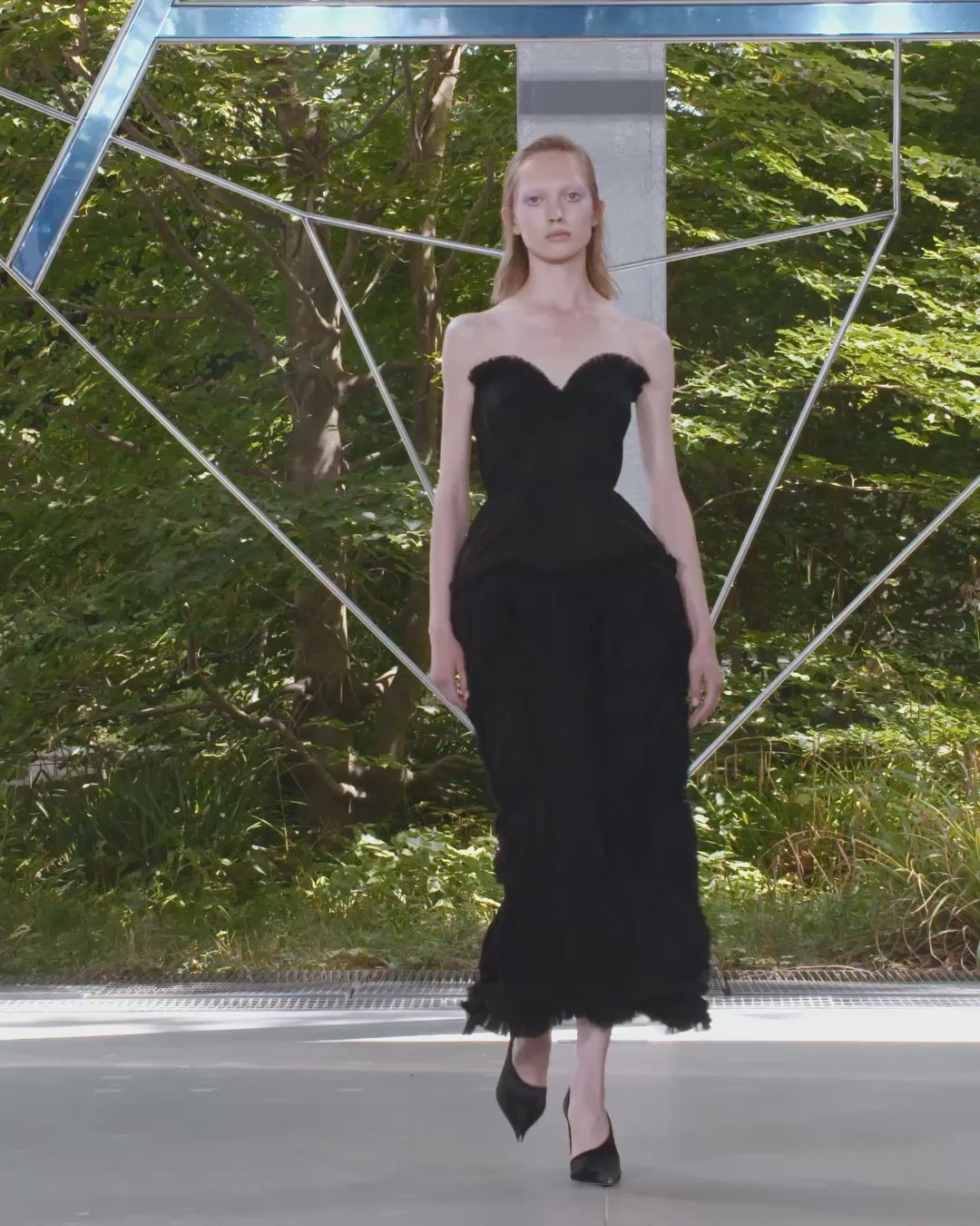 georgette of its cone-shaped skirt creates an illusion of geometric volume and distance. The cups of the corset and the vertical spines of the skirt are adorned with raw ruffles from the distinct pleating, while a long-sleeved draped top elongates the dress.
