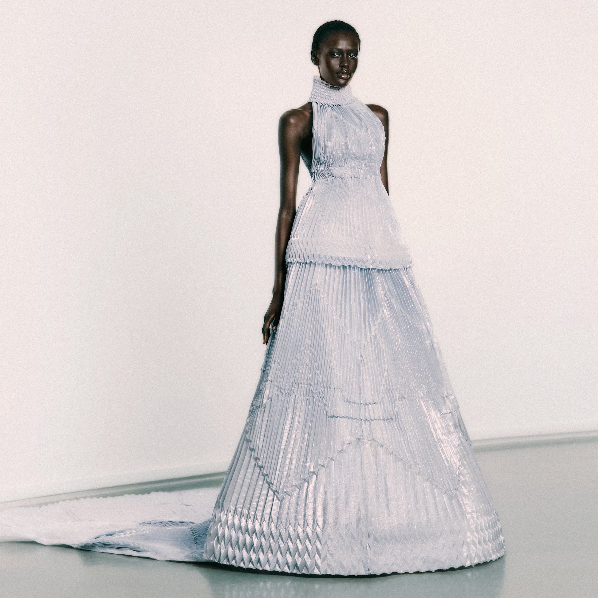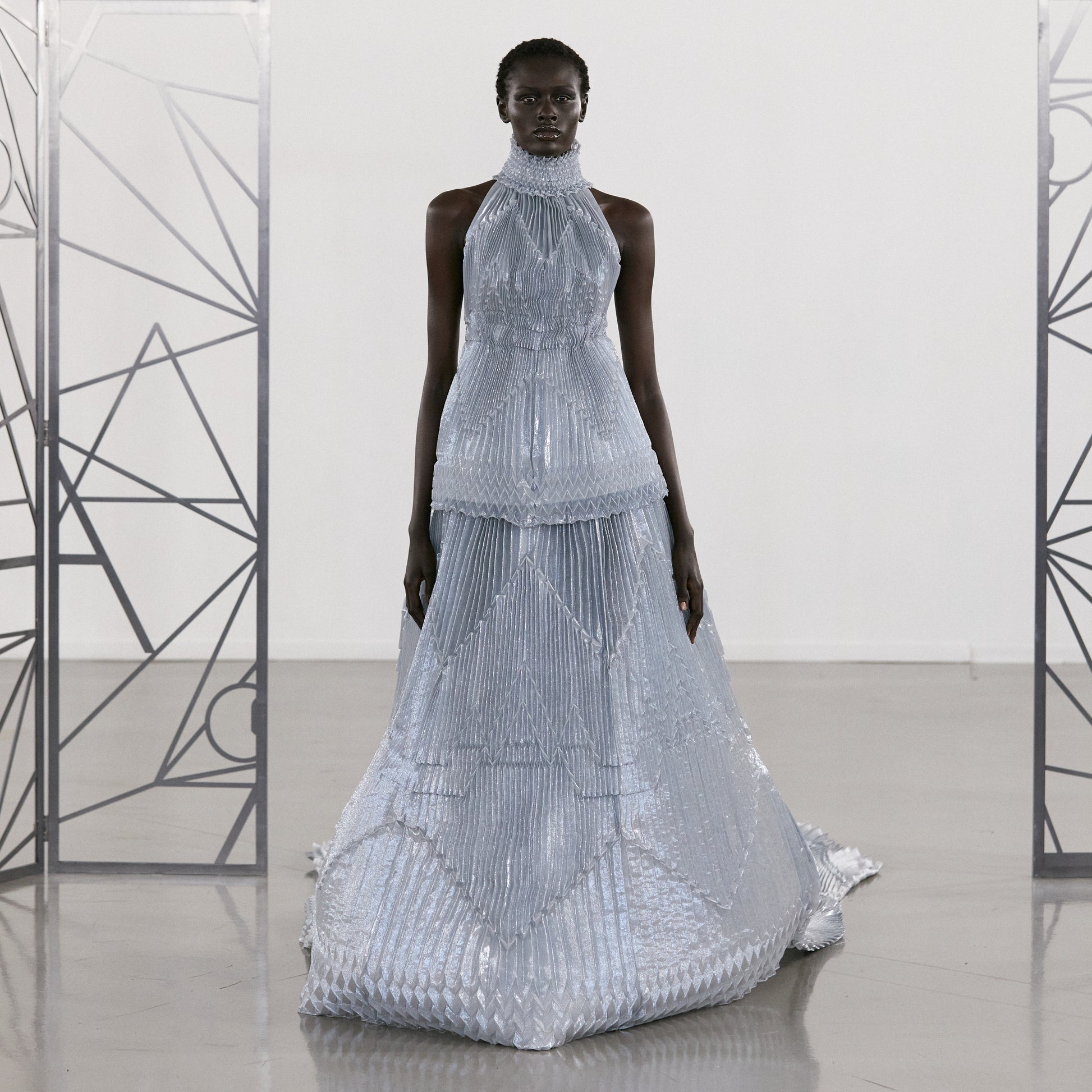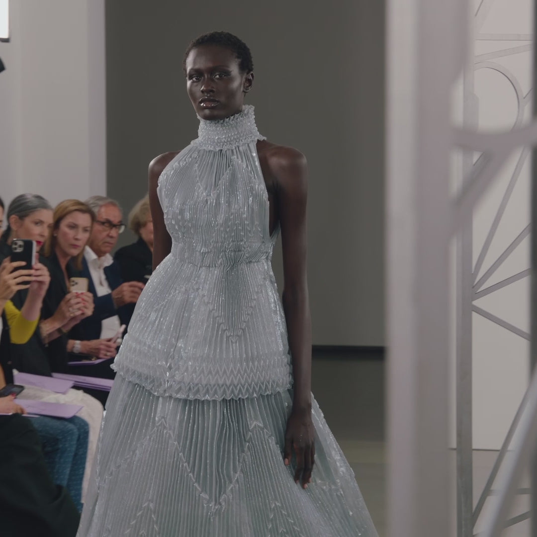 This evening gown showcases an intricate pleating technique, developed through a captivating collaboration between Bahareh Ardakani, the acclaimed folding artist Joan Sallas, and the pleating artisans of Les Ateliers Lognon. ◊ Drawing inspiration from ArdAzAei's emblem, Sallas translated its geometry into three-dimensional paper folds, which are then brought to life in the atelier in luxurious silk fabrics, carefully constructed into precise grids suitable for the art of pleating. ◊ Hand-folded moulds are crafted, and the delicate silk is placed within them with utmost precision, ensuring every pleat is flawlessly executed. ◊ The final creation, crafted from lightweight silk and adorned with metallic lurex, exudes a captivating play of light, thanks to its angular surface.