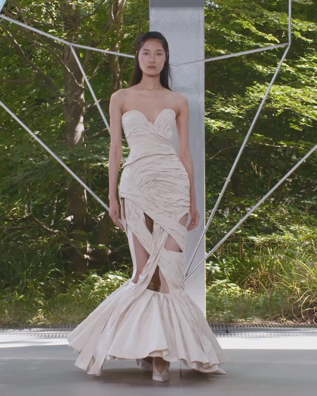 Sleeveless dress sculpturally draped by hand around the body in a swirling movement inspired by the sea. The watery drapes flow down the body, leaving certain areas exposed, before converging in a confluence of fabric below the knees. The fabric is silk cotton blend Ottoman faille; its folds are fixed in place by hand to resemble waves.