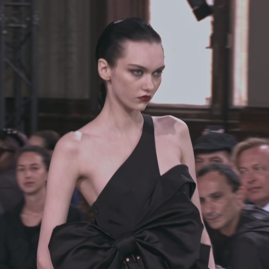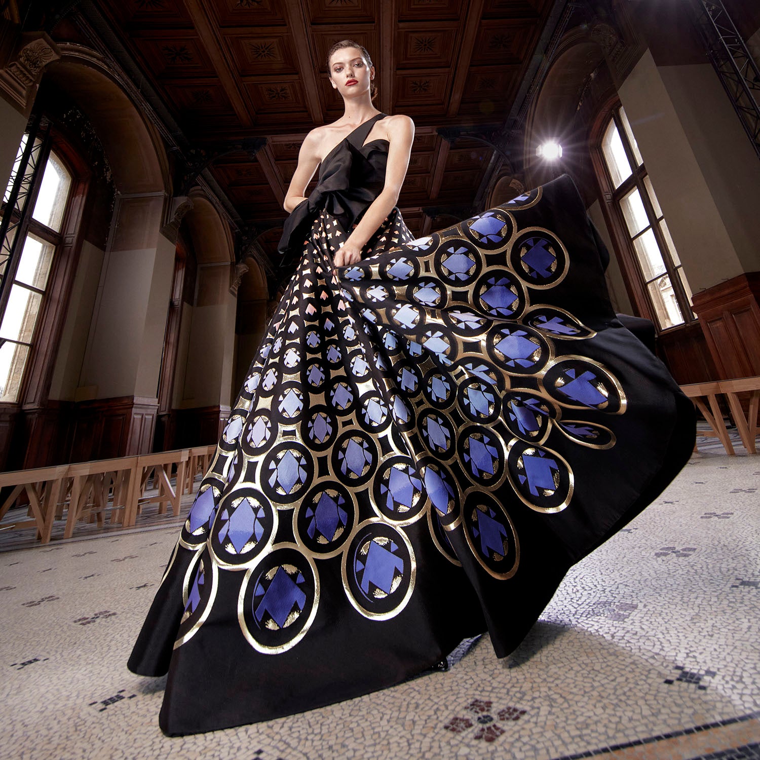 An evening gown revolving around mathematical patterns, this asymmetric bustier has a sculptural one-shoulder cut, contrasted with an oversized bow adorning the waist. ◊ The full-length circle skirt sees elements of the ArdAzAei logo abstracted to appear as a recurring, dégradé pattern crafted in silk-blend jacquard with interlaced metal threads.
