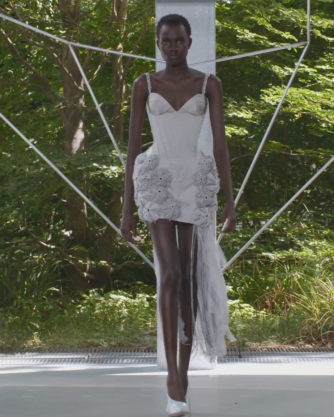 An homage to the ocean and the maritime roots of macramé, the technique of knotting cord created by sailors at sea, this look sees the collection’s signature corset adorned with thirty-four soft macramé sea urchins. These talismanic sea urchins, crafted from silk chiffon and embellished with pearls, are created by hand, taking between four and six hours each, depending on their size. The straps of the dress are also in a macramé that extends to the lower back, where the lacing of the corset forms the initial ‘V’. Tendrils of chiffon at the legs sway like kelp forests, one of the sea urchin’s natural habitats.
