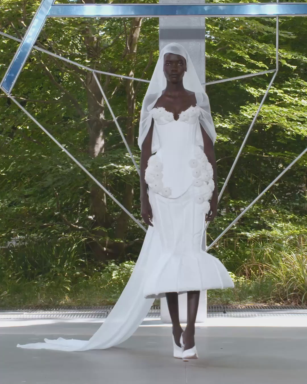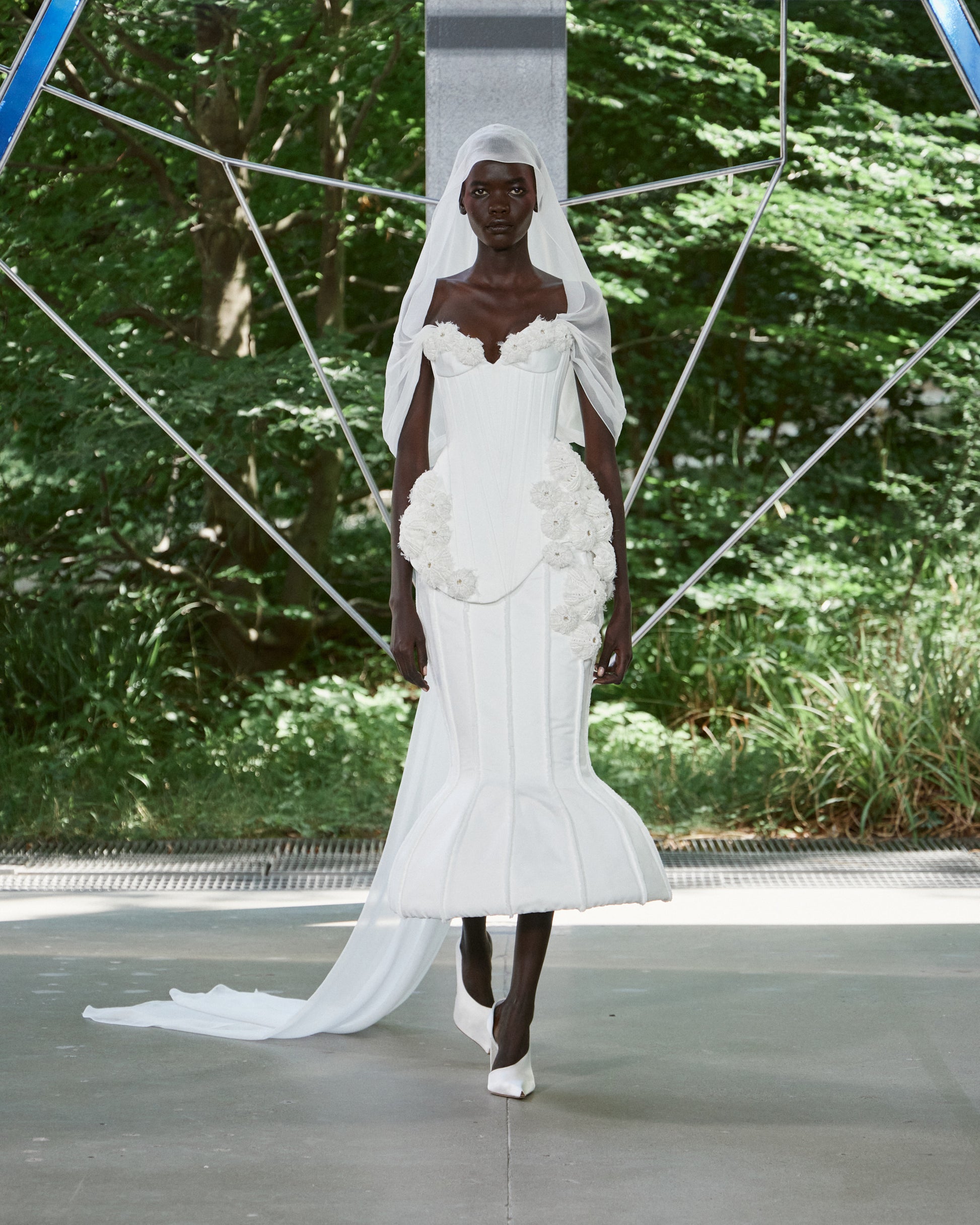 A gown adorned with twenty handmade macramé sea urchins climbing around the hips and corset cups. The skirt is fitted until the knees, where it merges into a structured crinoline with raw vertical hems, creating a cupped, half-sea urchin shape. Spinel stones embellish the sea urchins and reflect the light; a hooded chiffon veil, which gathers to a point at the back of the corset and falls in a long train.