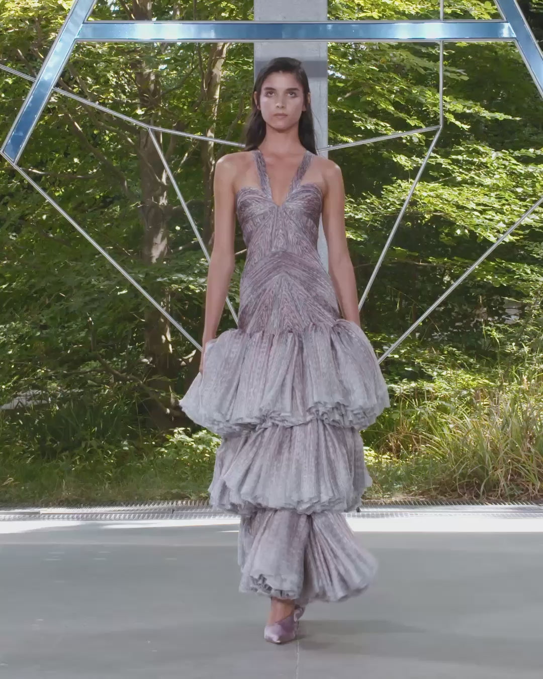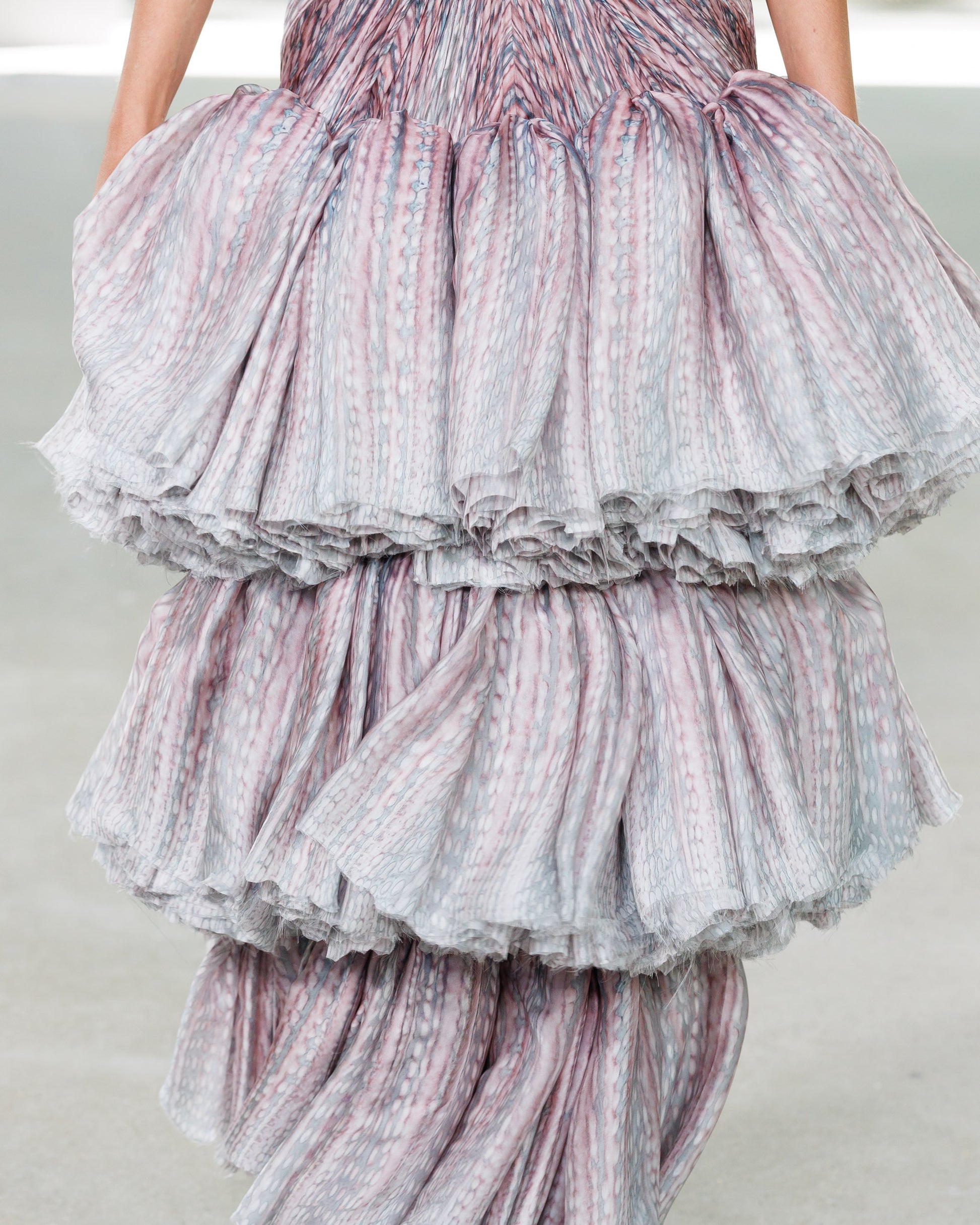 Fitted dress scrupulously draped in geometrical shapes around the body, fusing into three voluminous levels which gather more than 80 metres of fabric into light, organic ruffles. The fabric is a sheer charmeuse silk with a slight shimmering satin effect, custom-printed with a pattern inspired by the sea urchin. Through a delicate degradé technique, its colours transition from the highly saturated to soft, faded pastels, as the pleats reveal stripes alternating in rhythm between light and dark, adding fluidity and a sense of mystery to the silhouette.