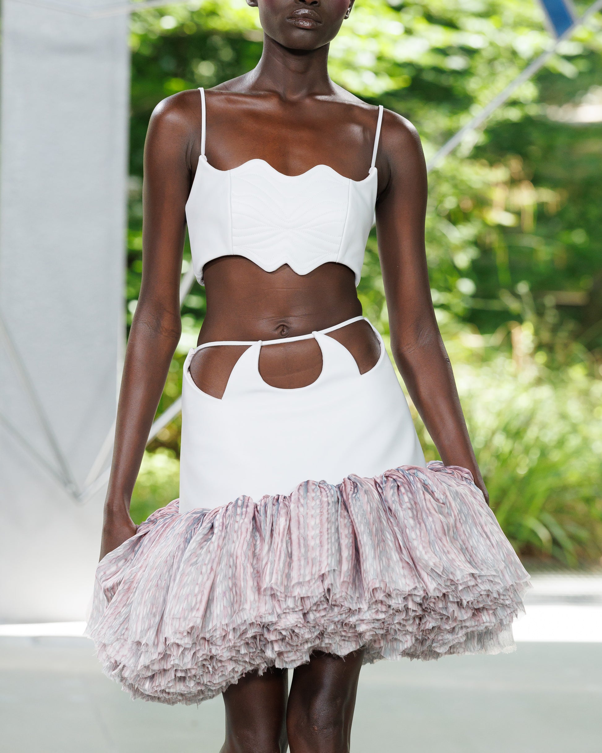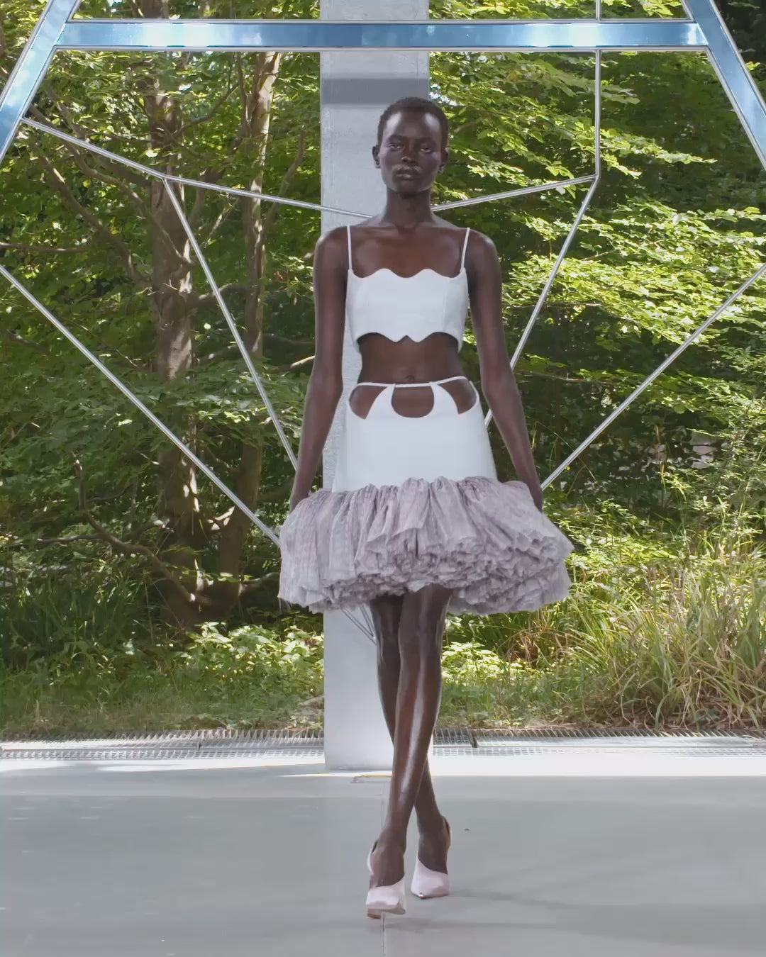 A two-piece look inspired by the rhythms of the coral reef, combining lambskin with a sheer charmeuse silk bespoke printed with a degradé sea urchin pattern which transitions from highly saturated colours to soft, faded pastels. The sculptural skirt gathers more than 25 metres of the charmeuse silk in waves, an effect echoed in the undulating quilting of its top.