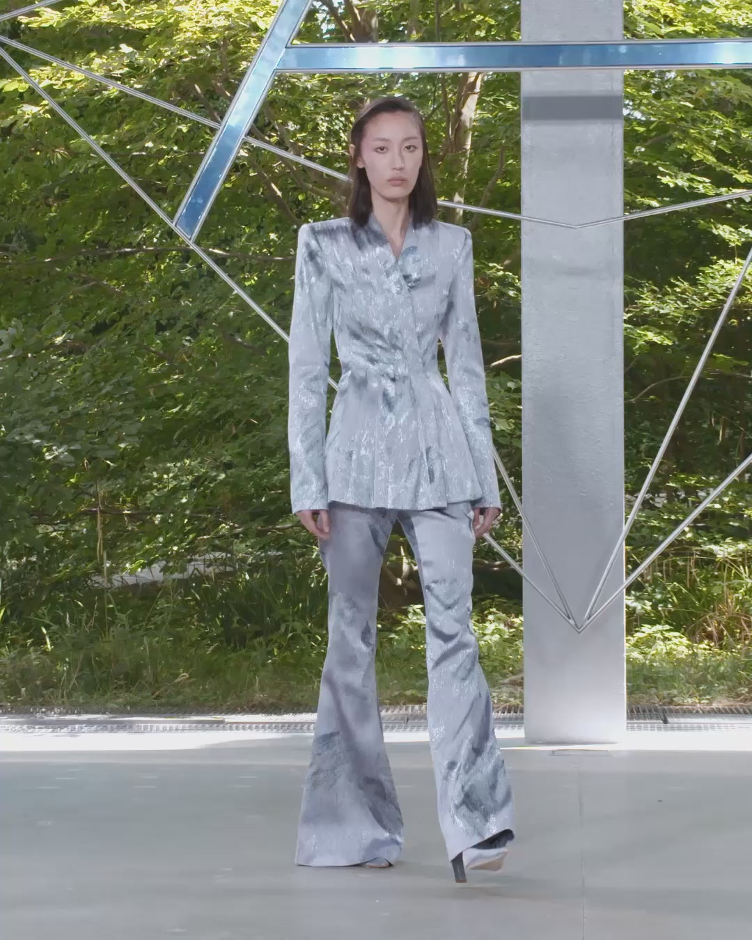 Tailored suit featuring ArdAzAei signature Artemesia jacket with pleated front and distinct geometric cuts on the back of sleeves, and flared trousers. Both pieces are composed of a bespoke, watery jacquard which began life as an original drawing of a sea urchin created by the Maison. Over two months of research and development went into interpreting this drawing on the loom in pure silk yarns, which have been enriched with lurex effects to create an immersive, underwater effect. The bespoke jacquard is also used on the reverse of the fabric, making the pattern even more abstract and iridescent.