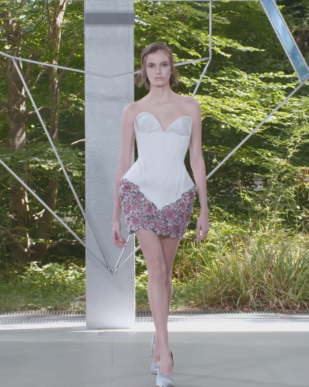 Minidress embroidered with 60 circular sea urchins, each handcrafted from fish scales and vintage beads and tubes in forty different materials. Structured around the collection’s signature corset, embroidered sea urchins adorn the hips reaching to the front and the back in a distinct geometrical V-shape.