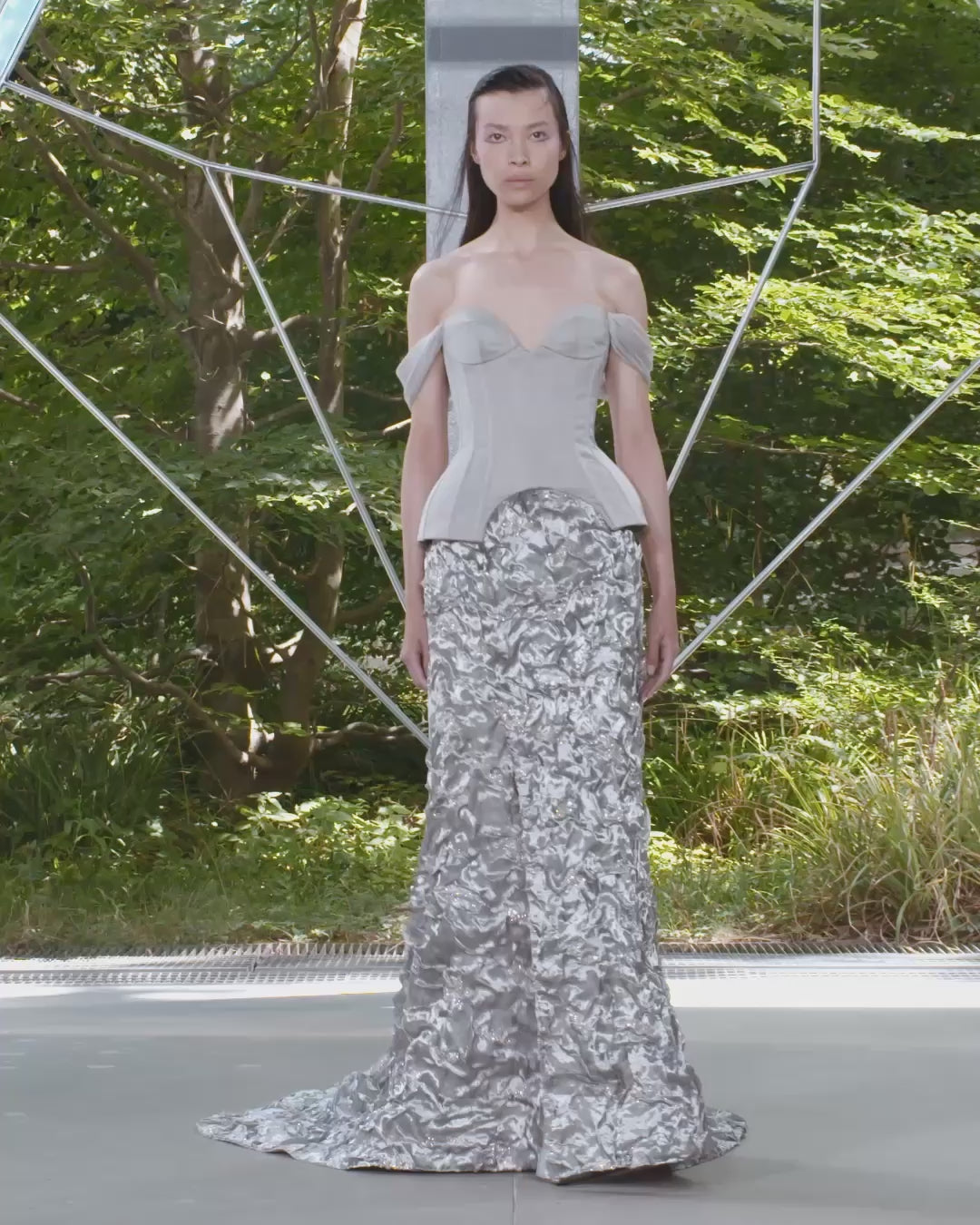 Evening gown in a metal silk blend, sculpturally draped by hand to create the illusion of a wet surface, with a skirt embroidered with 33,000 crystals by Swarovski® to evoke the impression of light reflecting off water. The piece sparkles with movement; the signature corset reaches past the hips to enhance the silhouette, and lightweight georgette meet the visible lacing. Over 500 hours of craftsmanship were invested in the hand-embroidery of the crystals.
