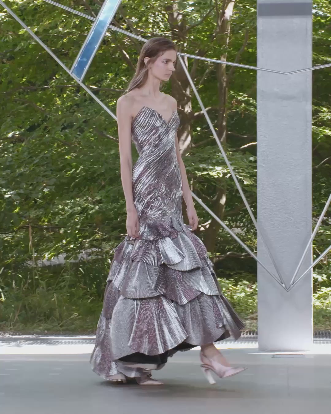 Evening gown featuring 6mm handcrafted accordion pleats that are draped around the body in a swirling movement before extending into a voluminous organza skirt embellished with 70 pleated fans. The fabric is a jacquard lamé enriched with silk and lurex, pleated in two directions so as to capture and radiate light from various angles, creating an illusion of bioluminescence.