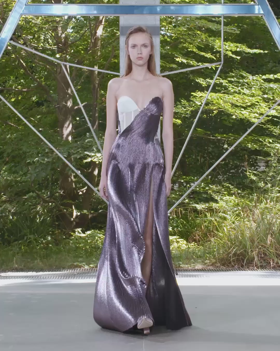 Sleeveless dress in a jacquard lamé enriched with silk and lurex, hand-pleated with 6mm accordion pleats and then draped around the body. The dress features a dramatic high slit at the front. Glimpses of its signature corset, in a cotton tulle and adorned with the motif of small sea urchins created by layering two layers of tulle, are visible through the pleats.