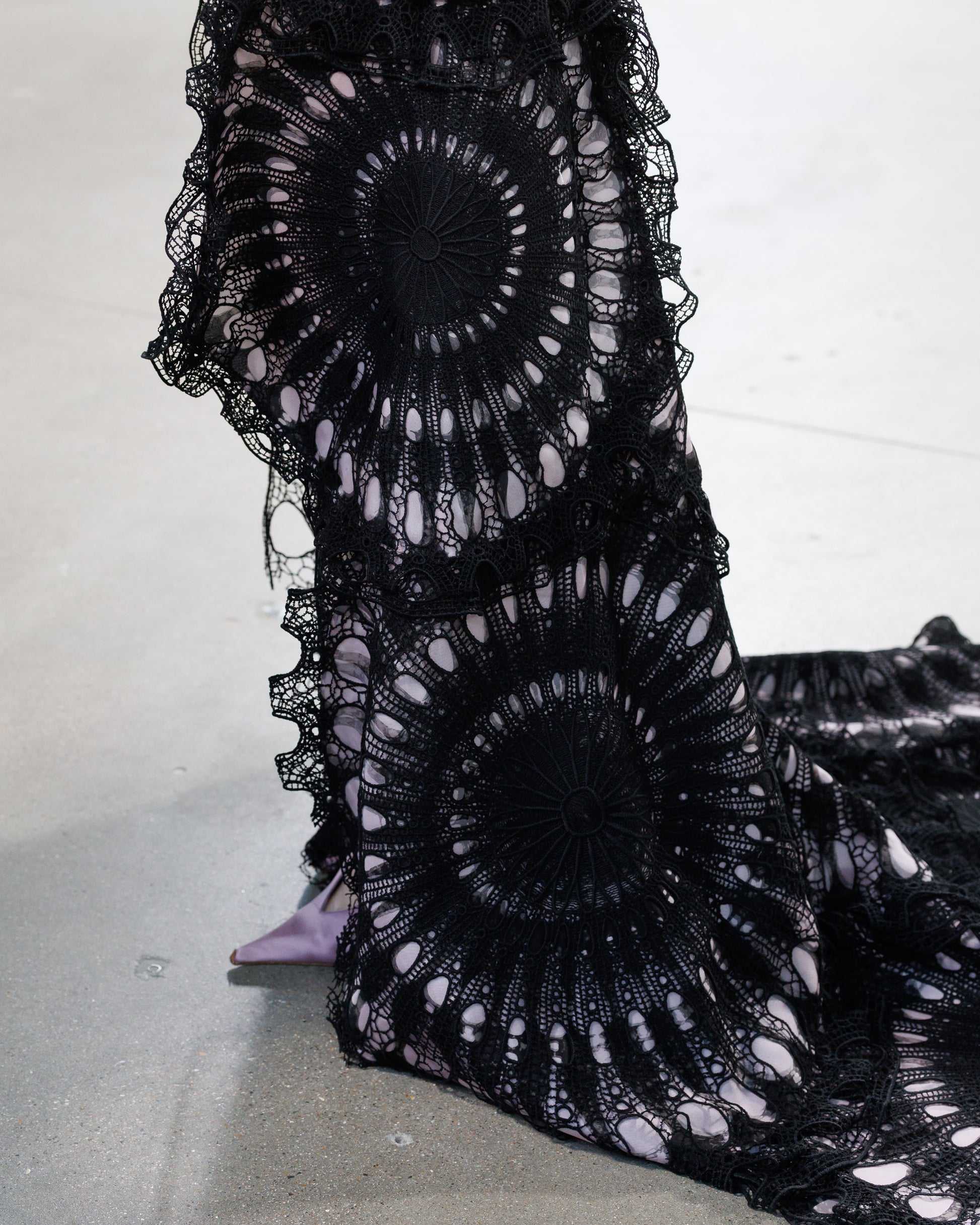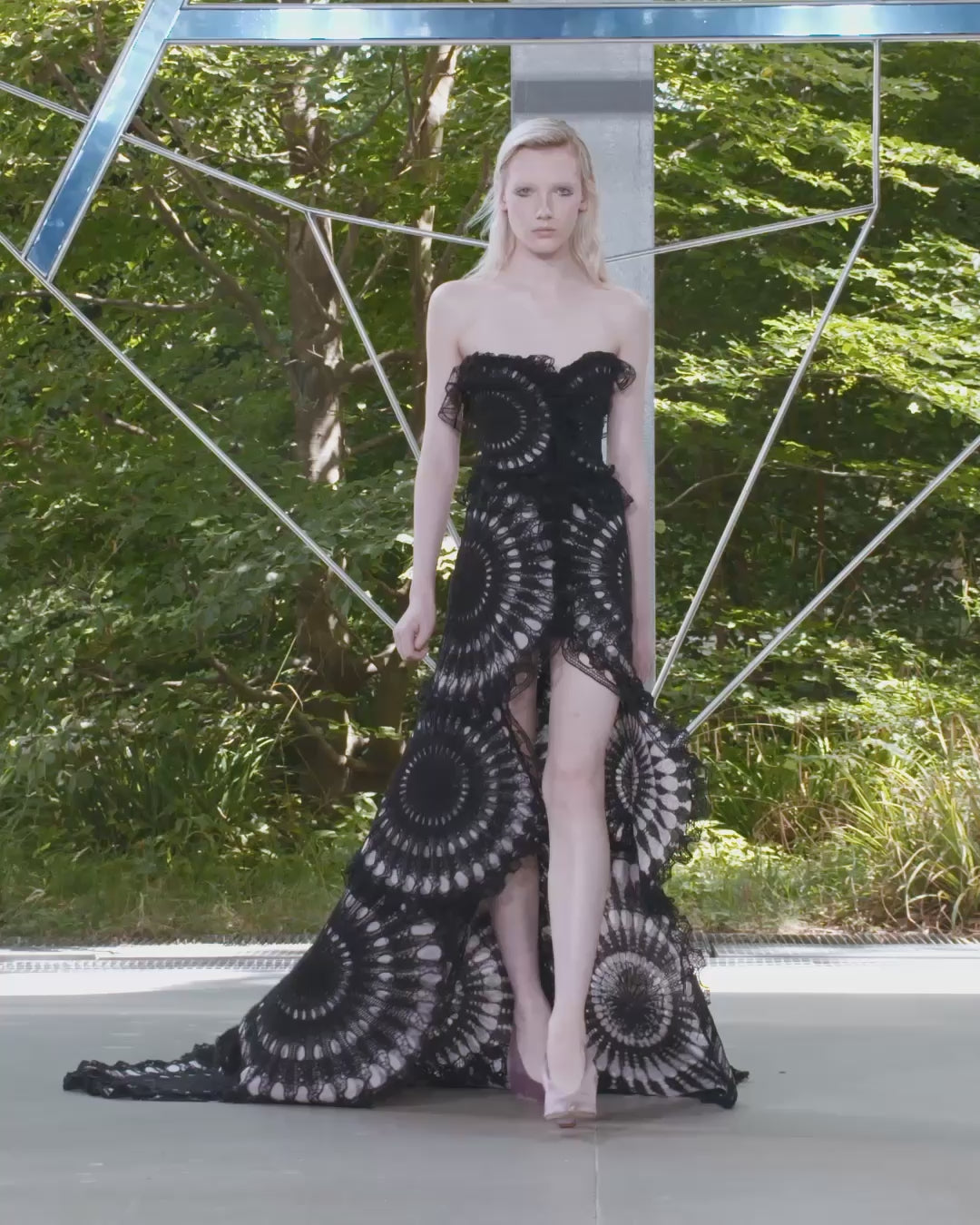 The seemingly alive circular pattern which radiates across the piece is created by the layer of guipure lace placed upon two layers of printed silk organza in different weights. Five months of research and development went into printing the silk organza panels with a motif inspired by SEM (Scanning Electron Microscope) images of the otherworldly landscape of a sea urchin’s skeleton. The print’s blurred three- dimensionality is created by placing printed panels slightly offset from one another, and the extended ruffled ends of the custom-made cotton guipure lace. The dress features an extended bustier and a fitted skirt, accentuating the strong silhouette.