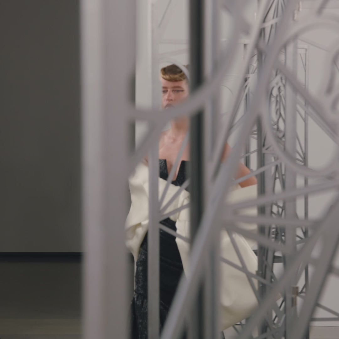 The fitted silhouette is tailored from lustrous, lightweight silk. ◊ Draped pleats envelop the waist and hips, and the flared skirt unveils its semi-transparent beauty, playing a game of light and shadow within its pleated folds. ◊ Contrasting the slim silhouette is an architectural heavy silk bow enveloping the body.