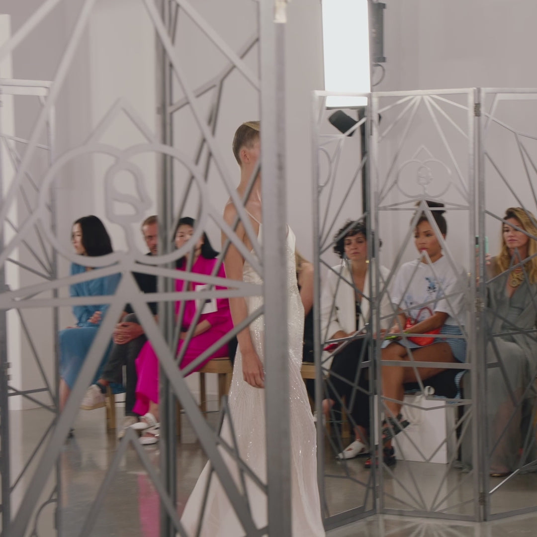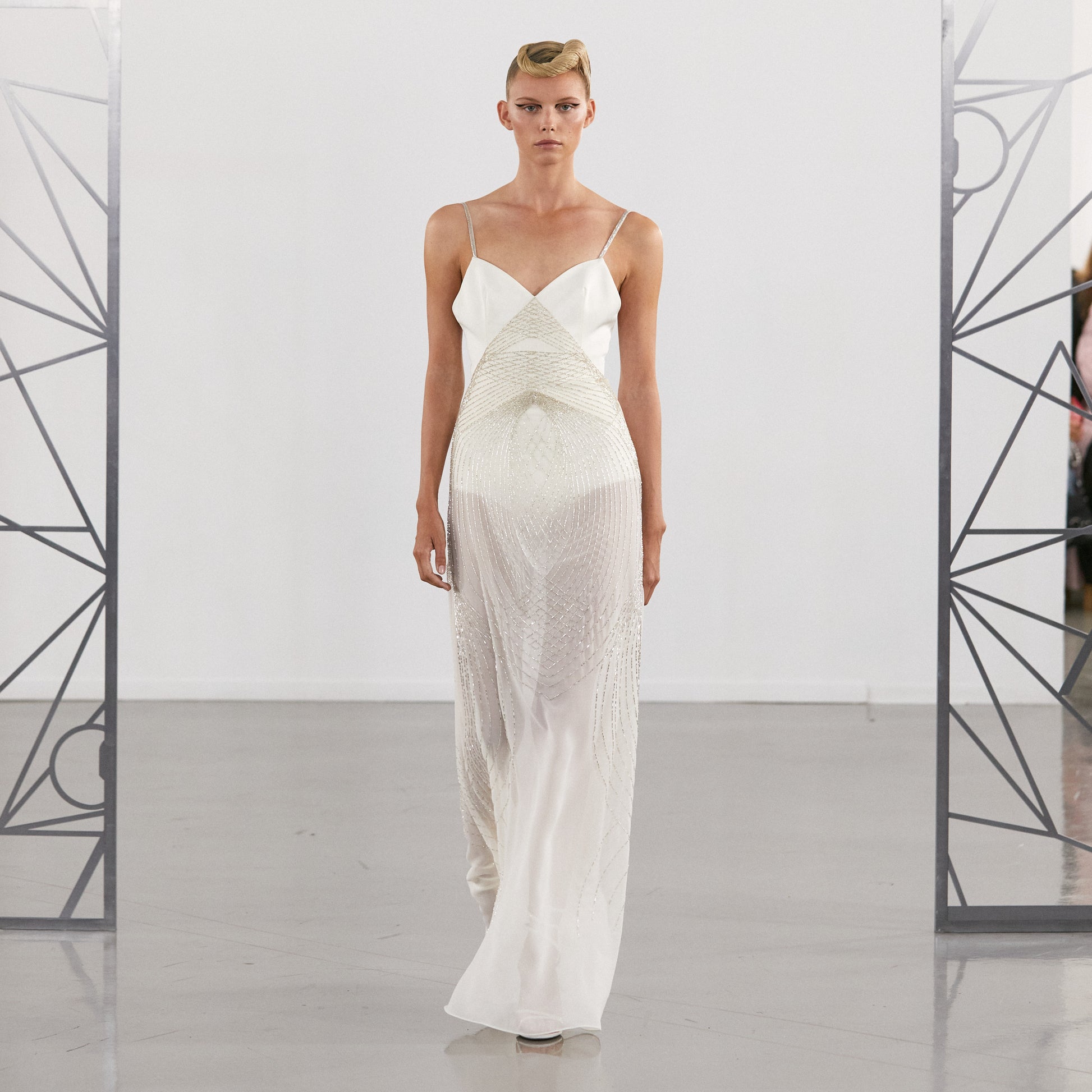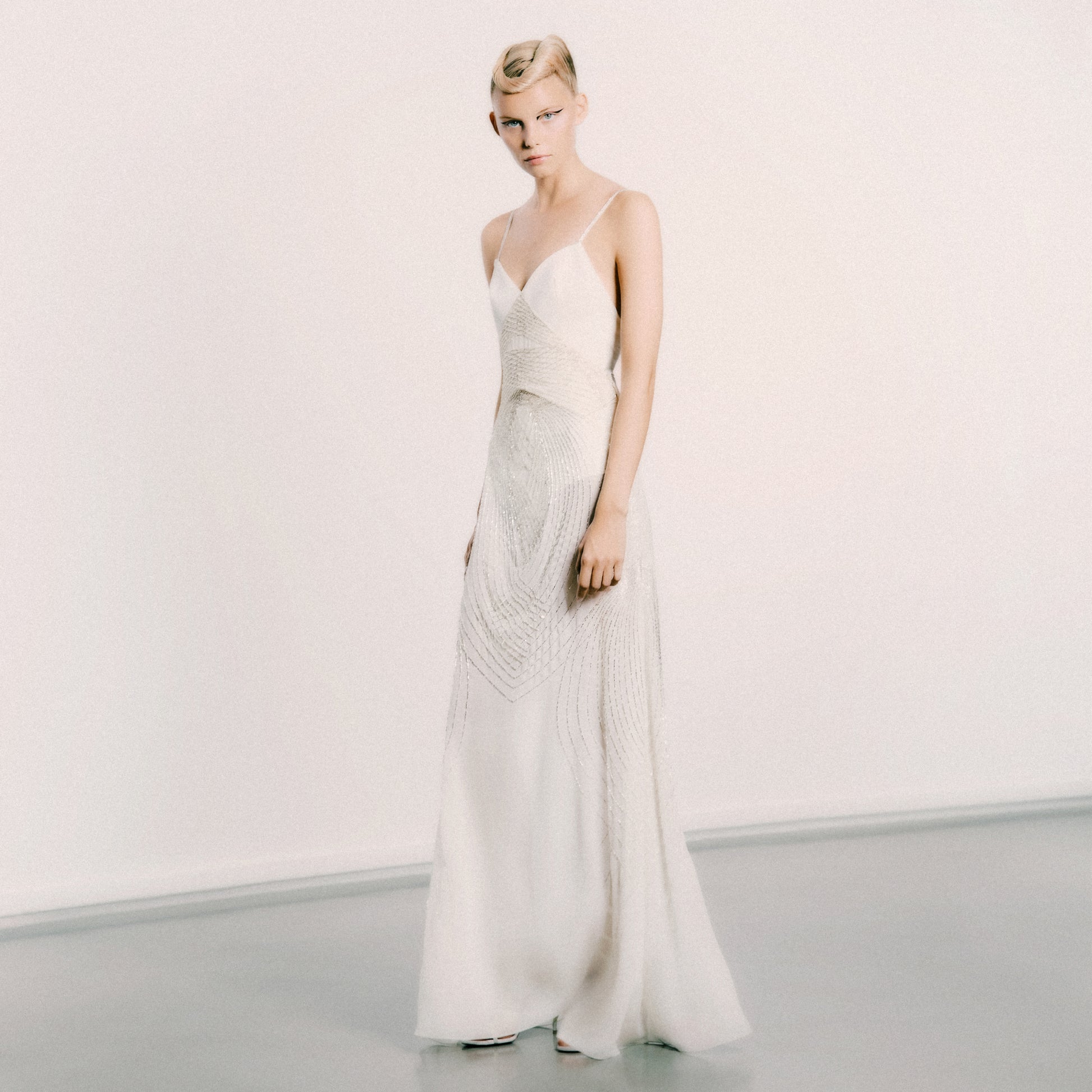 A sheer evening gown crafted in silk crêpe with a structured interior body in silk duchesse. ◊ The gown has a deep V-cut in the back, thin embroidered shoulder straps, and a fluid semi-transparent full-length skirt. ◊ Inspired by sacred geometry, the fine crêpe is hand-embroidered with light-reflecting metal beads, creating an embellishment of degradé graphic lines around the body.