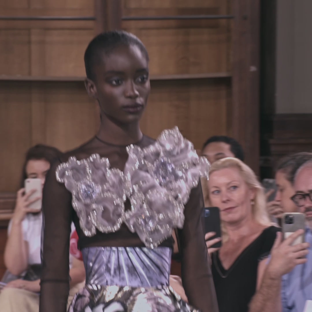 An intricate look featuring a fitted top in fine tulle elaborated with three-dimensional magnified flowers, crafted in layers of the world’s lightest organza with hand-painted degradé shades and hand-embroidered edges. ◊ The voluminous skirt is made following a mathematical construction with layers of cut out amplified, exploded flowers in a silk-blend fil coupé jacquard.