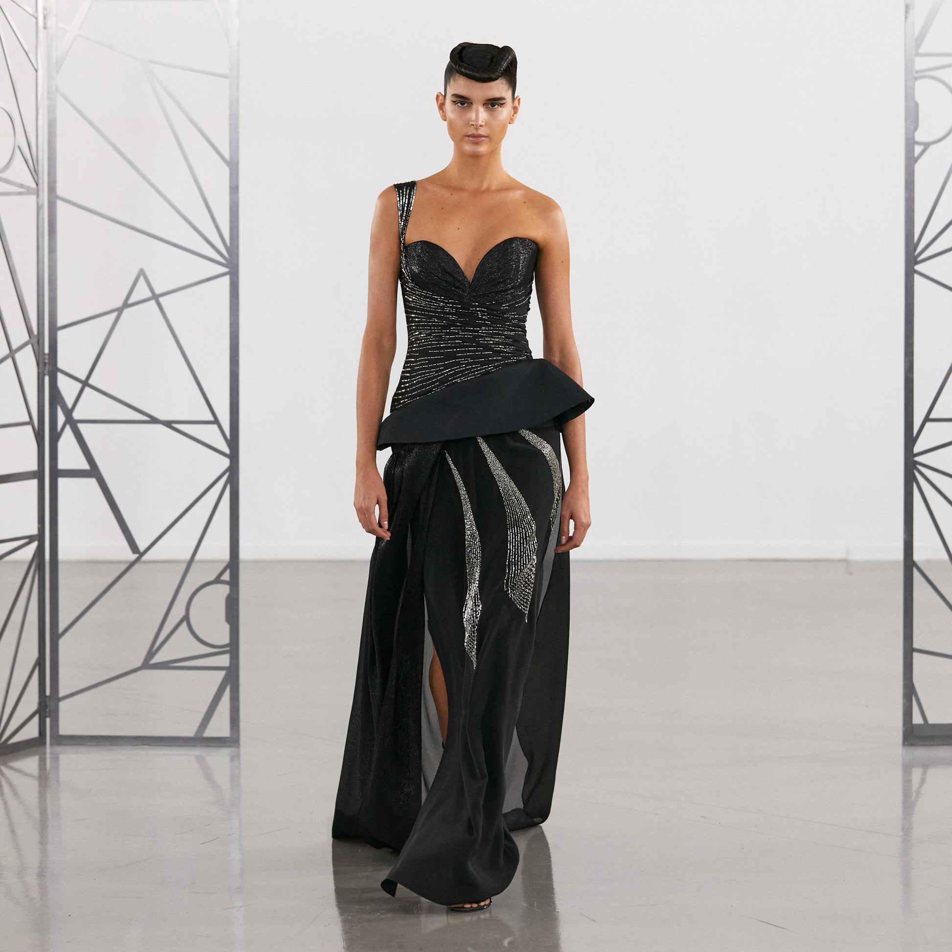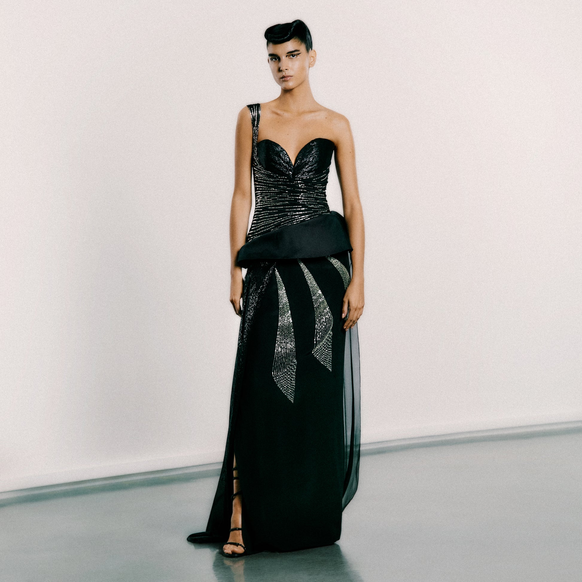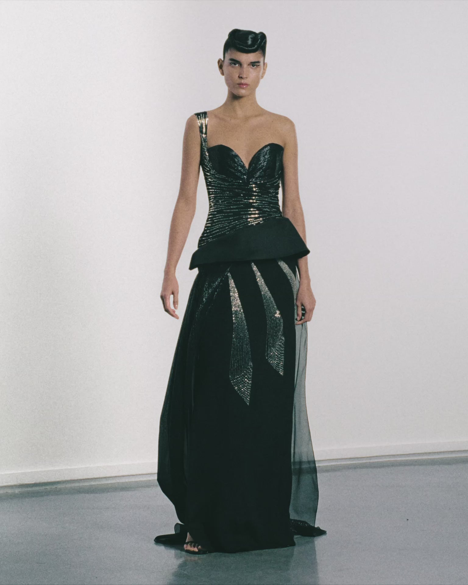 An asymmetric gown where shades of black and silver intertwine to create a captivating play of light. ◊ At the heart of this gown is a structured one-shoulder top. ◊ Delicate hand-embroidered lines adorned with archive beads swirl around the torso, adding a touch of sparkle to the ensemble. ◊ The skirt is crafted from light silk crêpe. ◊ Embroidered motifs, reminiscent of celestial patterns, radiate from the hips, creating a sense of movement and grace. ◊ A basque in silk organdy is positioned on the diagonal hipline, lending sculptural shape, while a semi-transparent shimmering silk skirt gently captures the feeling of ethereal elegance.