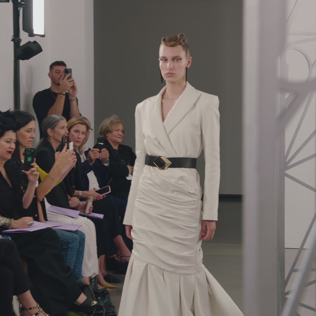A coatdress, crafted from supple, vegetable-tanned reindeer leather sourced from northern Sweden. ◊ The soft leather drapes around the hips, accentuating the waist and highlighting the feminine silhouette. ◊ The skirt of this coatdress boasts pleated volume, adding a touch of dynamic flair to the overall design.